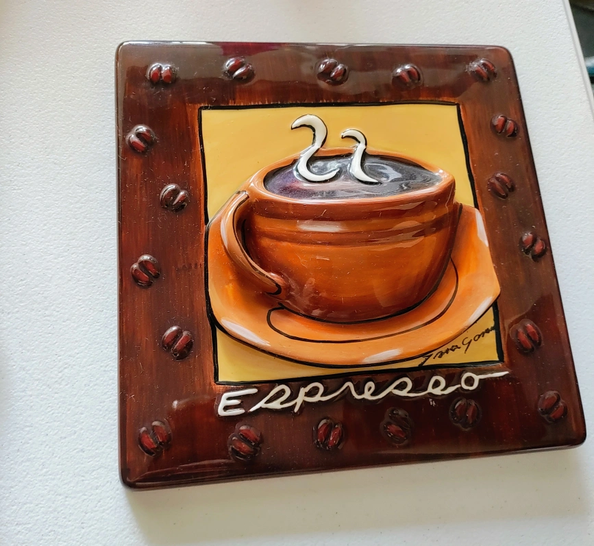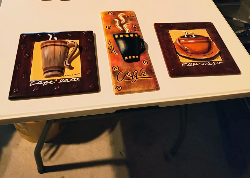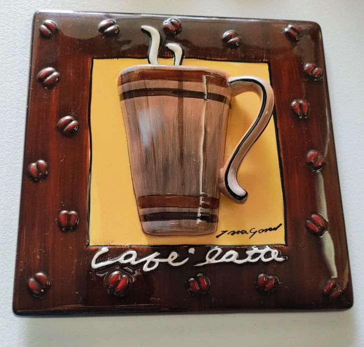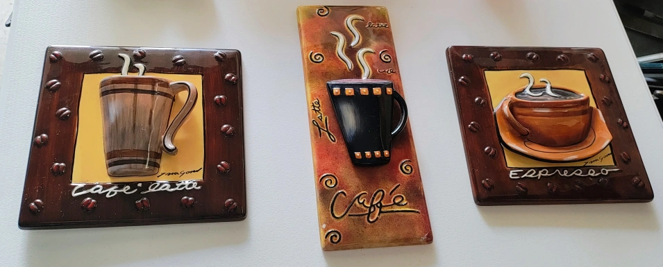 Tara Gamel 3D Wall Hangings Espresso & Cafe' Latte Coffee Cup Art Signed Not sure if the 3rd one(long one) is Tara Gamel as I don't see a signature on that one. $10 each or all for $25. Cash only. Pick up only.