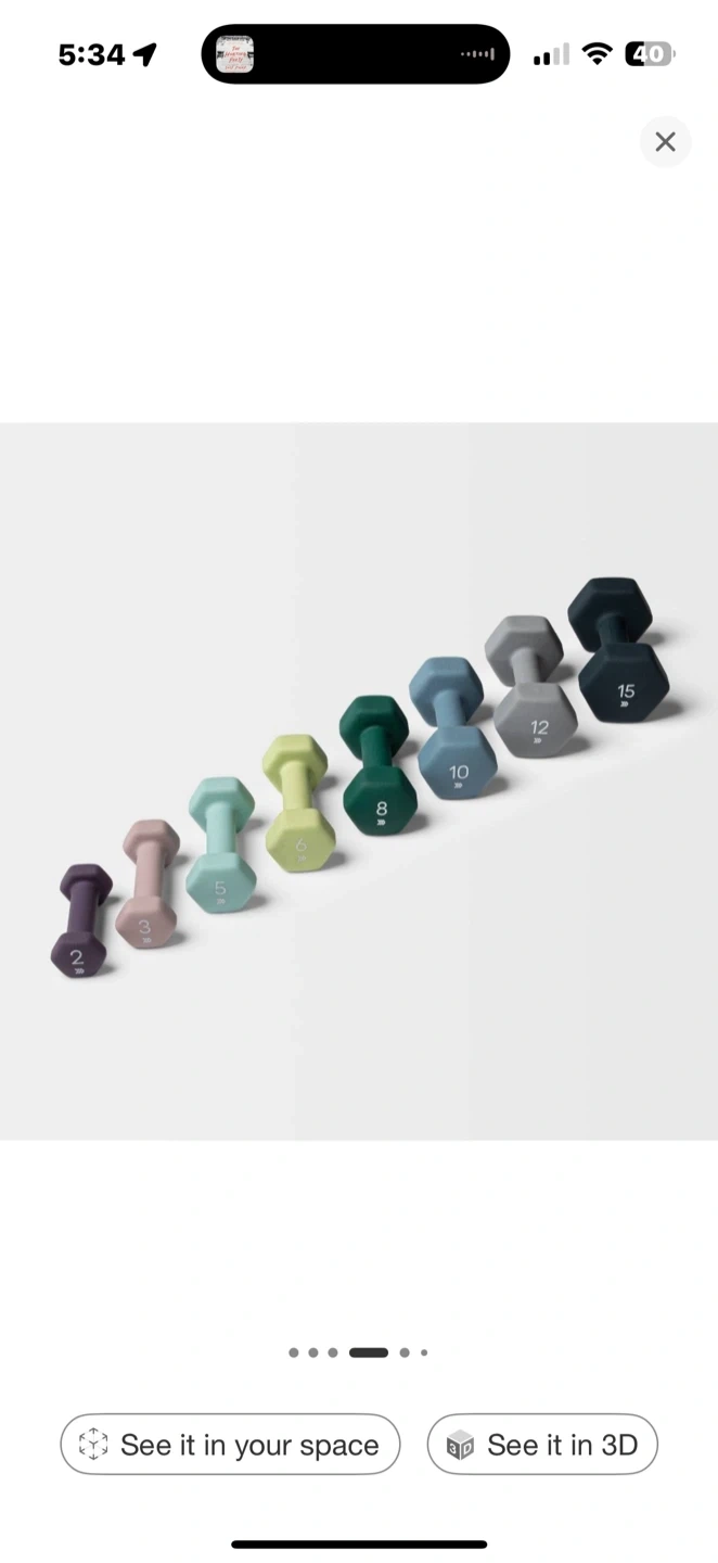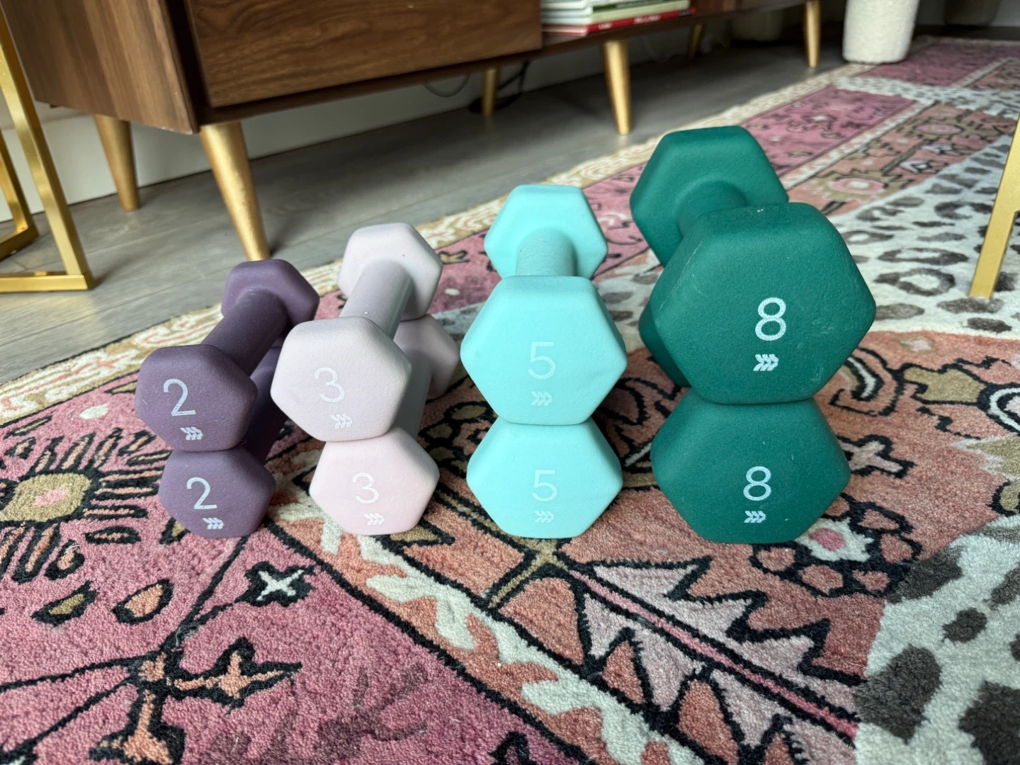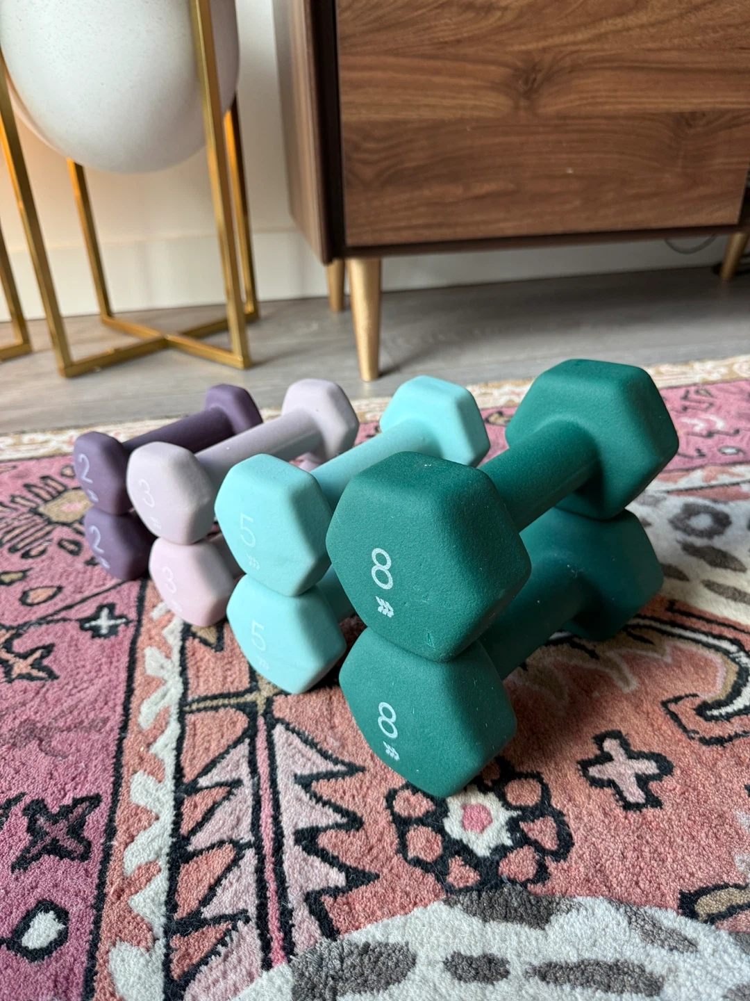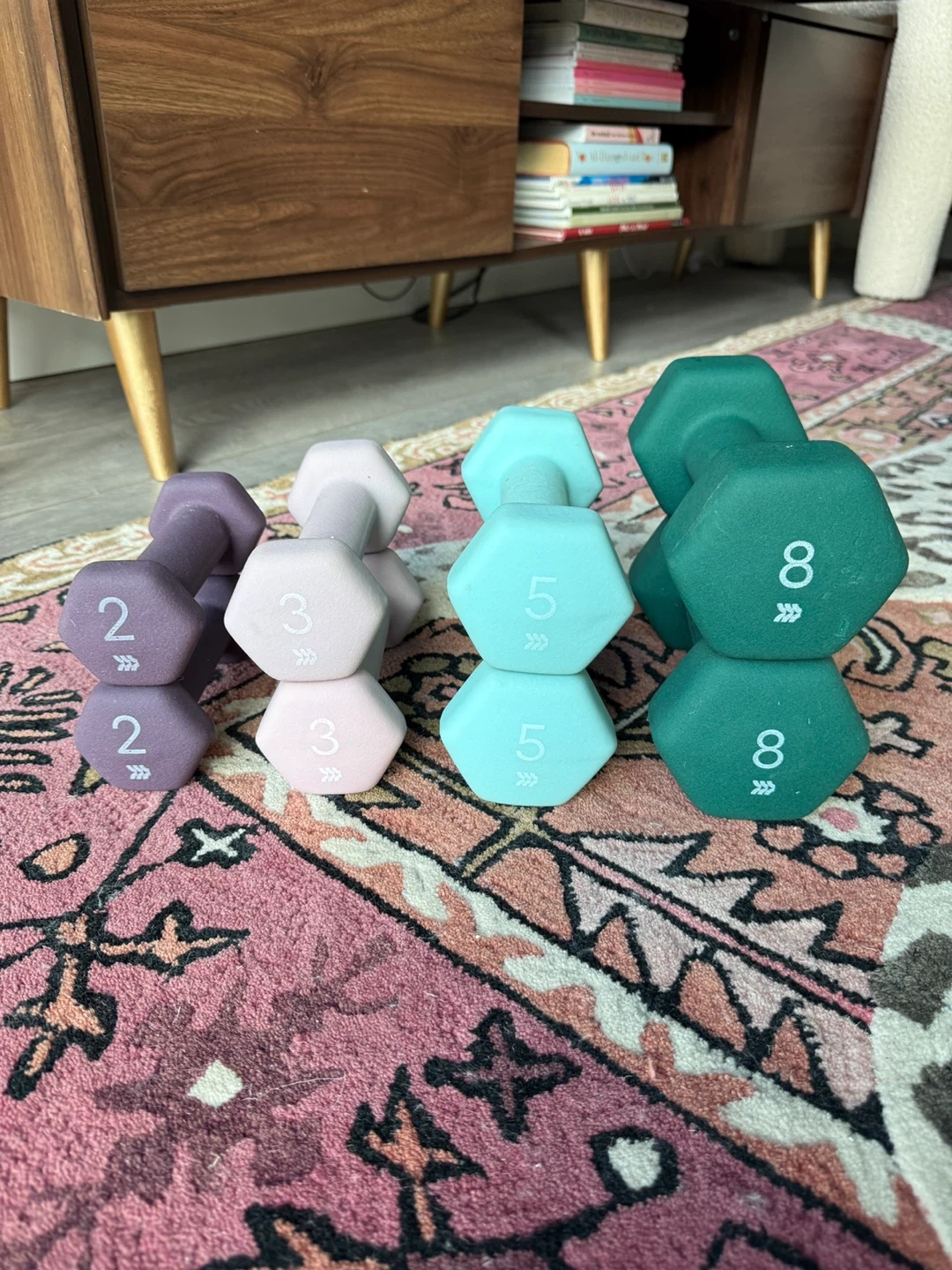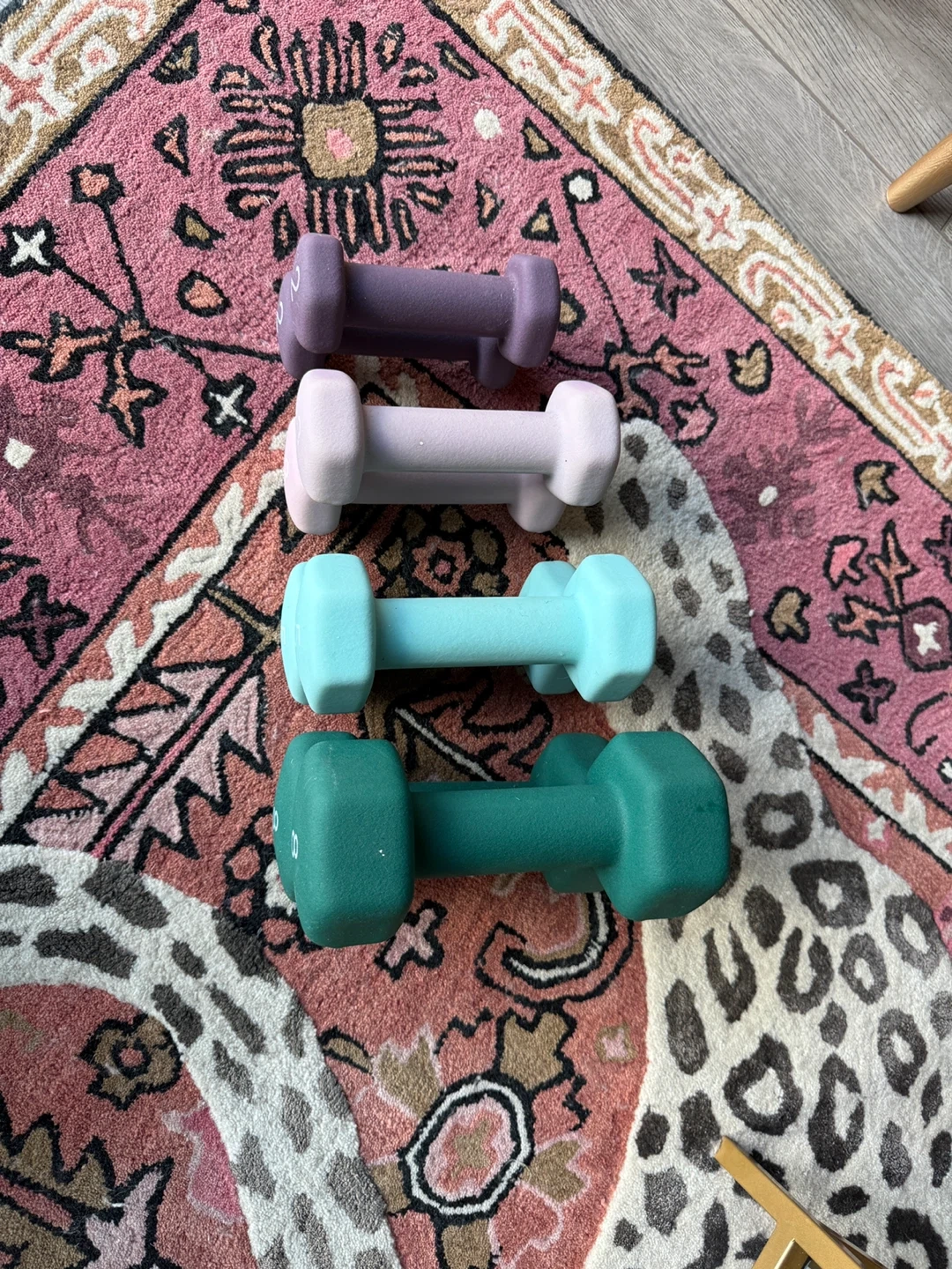 23Selling a set of dumbbells in great condition! This set includes: - 2lb dumbbells (purple) - 3lb dumbbells (pink) - 5lb dumbbells (light blue) - 8lb dumbbells (green) Perfect for home workouts or adding resistance to your routine Why we're ALL IN: Tone and strengthen your arms, chest and shoulders with the help of hand weights that have hexagon-shaped heads to prevent them from rolling as you switch between exercises. Each weight comes with a comfortable non-slip inlaid texture (Neoprene) for a superior grip during even the sweatiest exercise so you can focus on your body and movement. A range of different weights in color-coded designs make it easy for you to start — or continue on — your journey to feeling and being your best self.