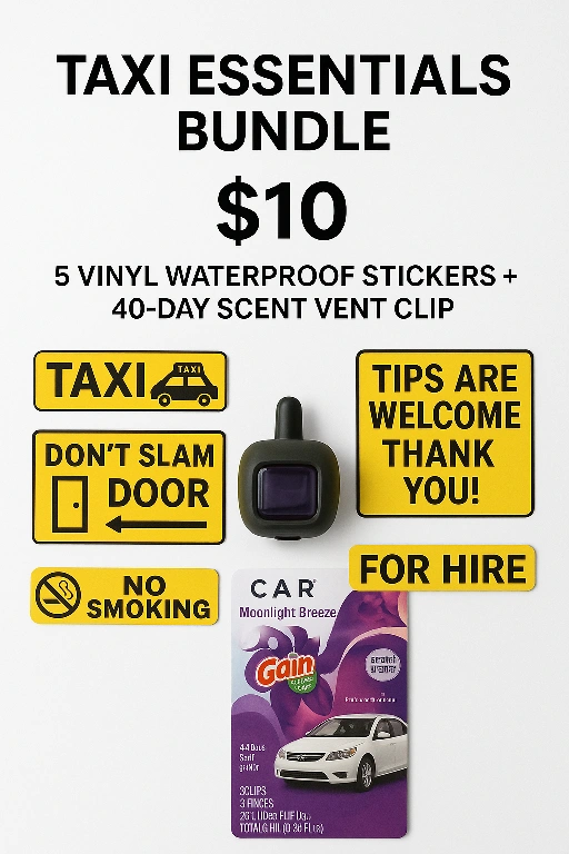 Selling a Taxi Essentials Bundle! It includes 5 vinyl waterproof stickers and a 40-day scent vent clip. The air freshener is a CAR Moonlight Breeze scent with Gain. Perfect for adding some personality to your taxi!