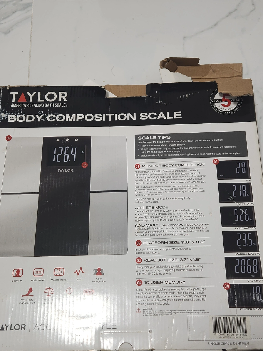 Selling a Taylor Body Composition Scale in excellent condition! It's like new and ready to help you track your health goals. Key features include: - Monitor body composition (Body Fat, Body Water, Muscle Mass, BMI) - Athlete mode - Platform size: 11.8" x 11.8" - 10 User memory It has a step-on feature and provides accurate measurements in 0.2 lb increments