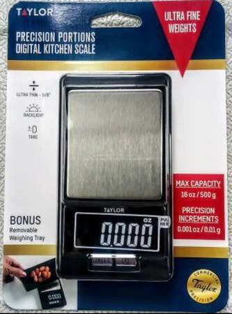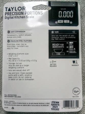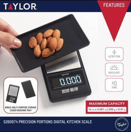 38Taylor High-Precision Digital Portioning Scale with Cover is New About this item Quality and Precision: Using only the highest quality components for accurate weighing measure precisely in both standard and metric units up to 16oz/500g with ultra-fine 0 001oz/0 01g increments Compact Size: For an on-the-go lifestyle, this scale is built to travel easilyg. The overall size is 4 5" X 2 5" with a slim profile Versatile Design: This product includes a snap-on storage cover that doubles as extended weighing platform The weighing tray contains small items during use Simple & Convenient: Weighing foods and small items should be hassle free so this scale has intuitive features like auto-off (to conserve battery life) Tare (Zero weights between additions) and even a low battery indicator as a reminder for replacement Easy to Read: The 0 5" Lcd readout is illuminated with a bright backlight for easier reading in low light spaces