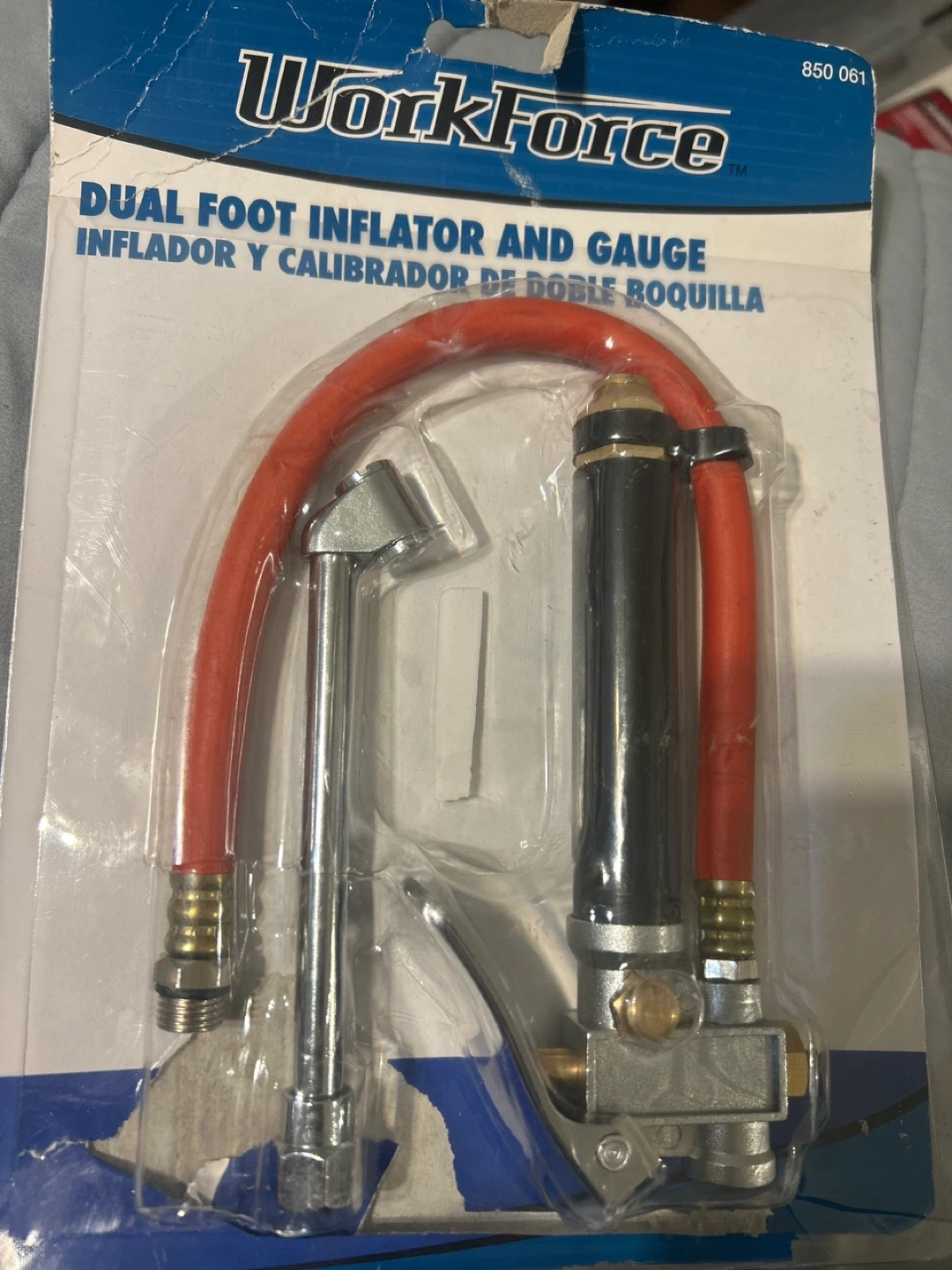 This is a WorkForce dual foot inflator and gauge. It's designed for easy tire inflation and pressure checks. Includes a red hose and metal components.