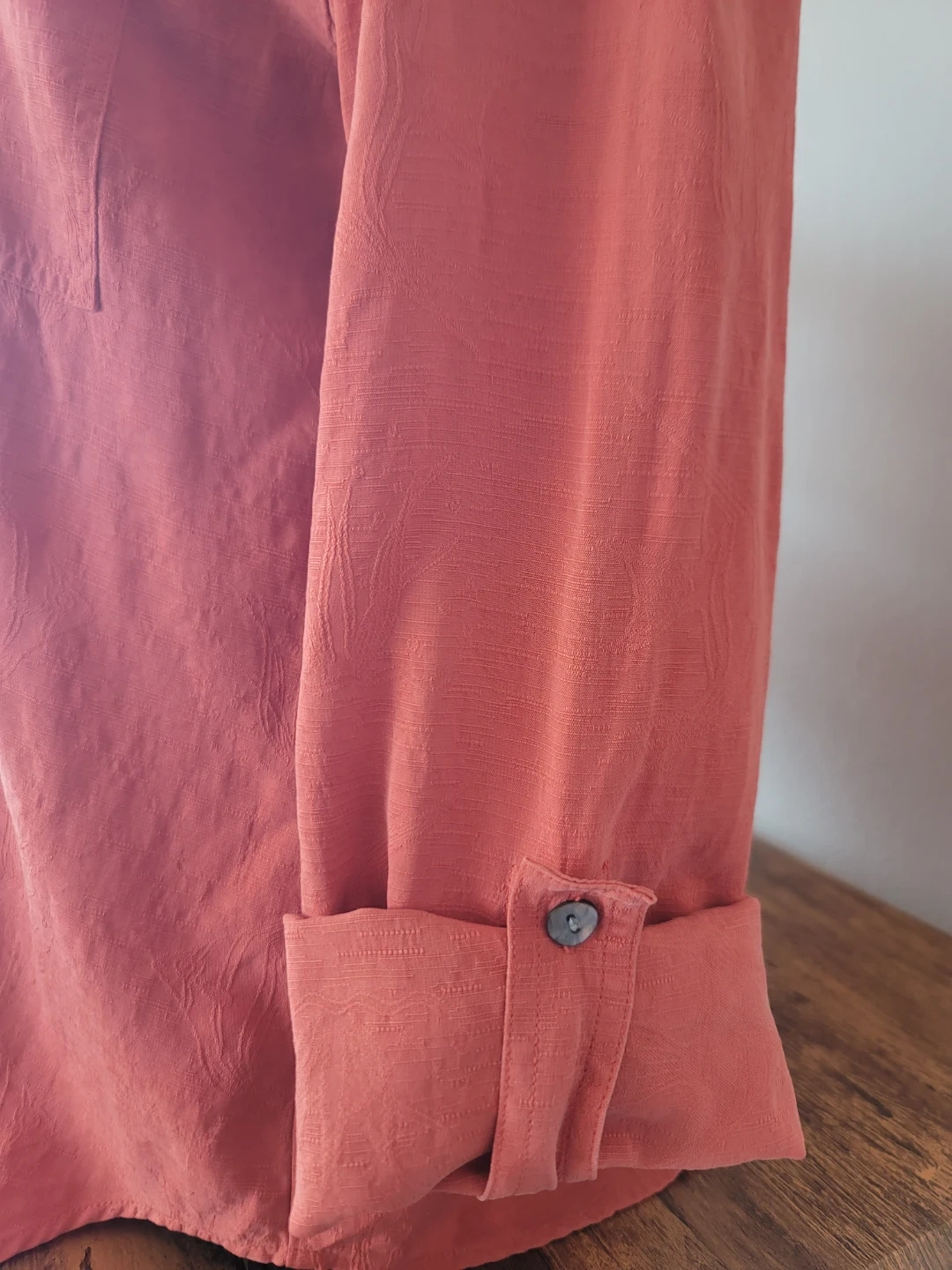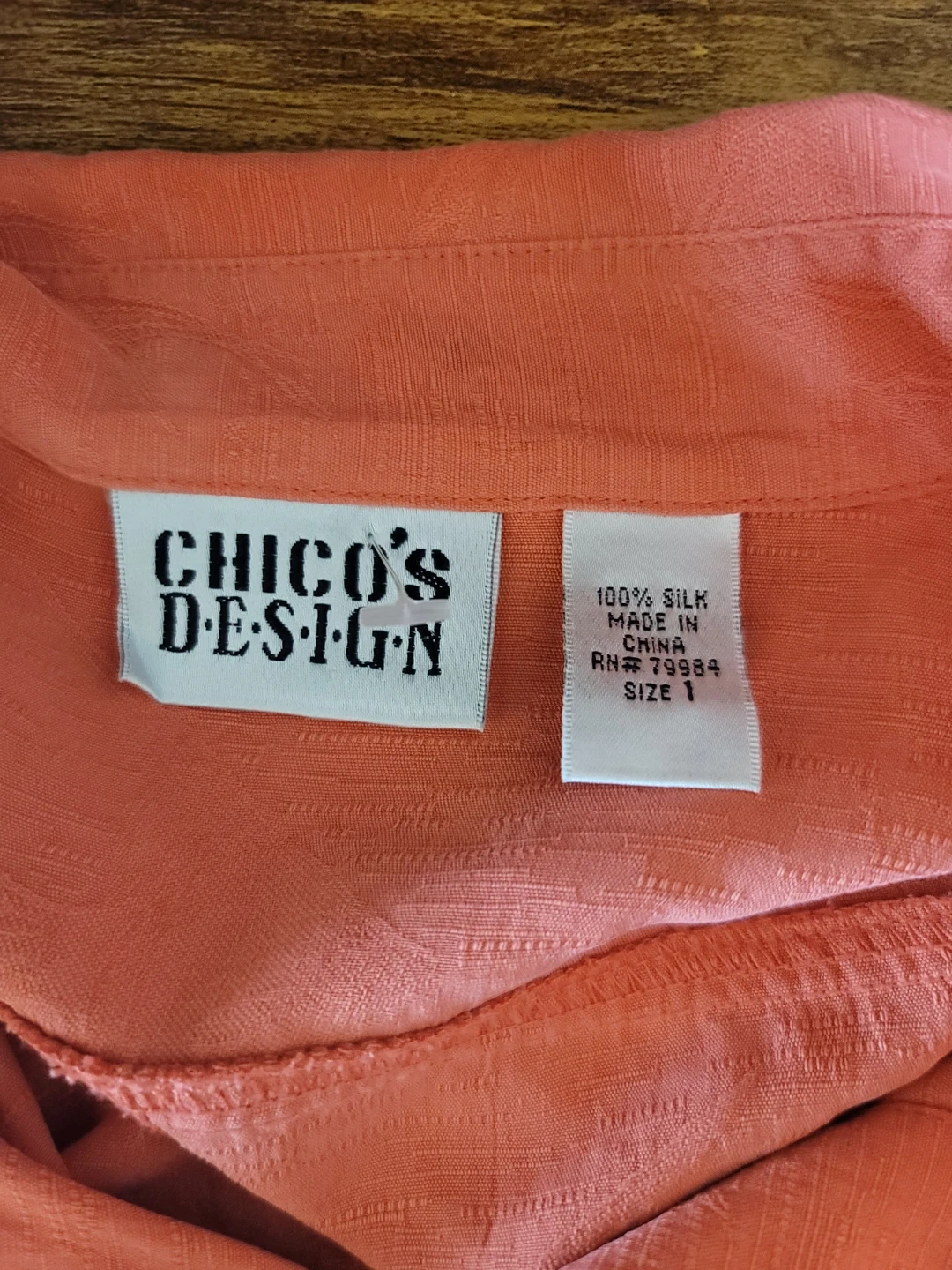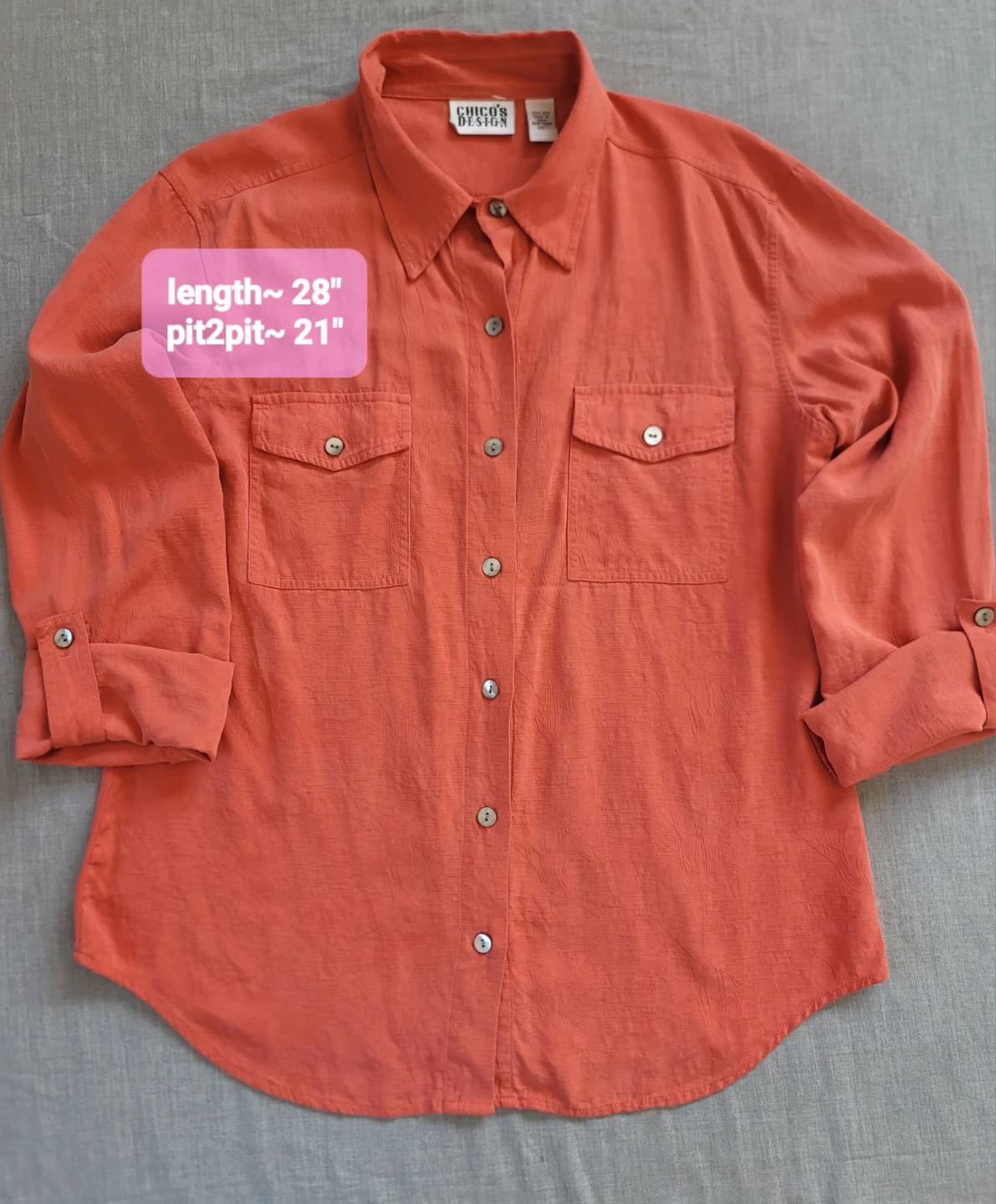 Here's a beautiful button-down shirt from Chico's Design! It's made of 100% silk and is marked as a size 1. The color is a lovely coral shade. Approximate measurements are: Length ~ 28", Pit to pit ~ 21"