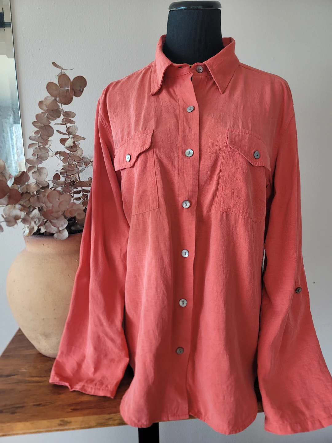 Here's a beautiful button-down shirt from Chico's Design! It's made of 100% silk and is marked as a size 1. The color is a lovely coral shade. Approximate measurements are: Length ~ 28", Pit to pit ~ 21"