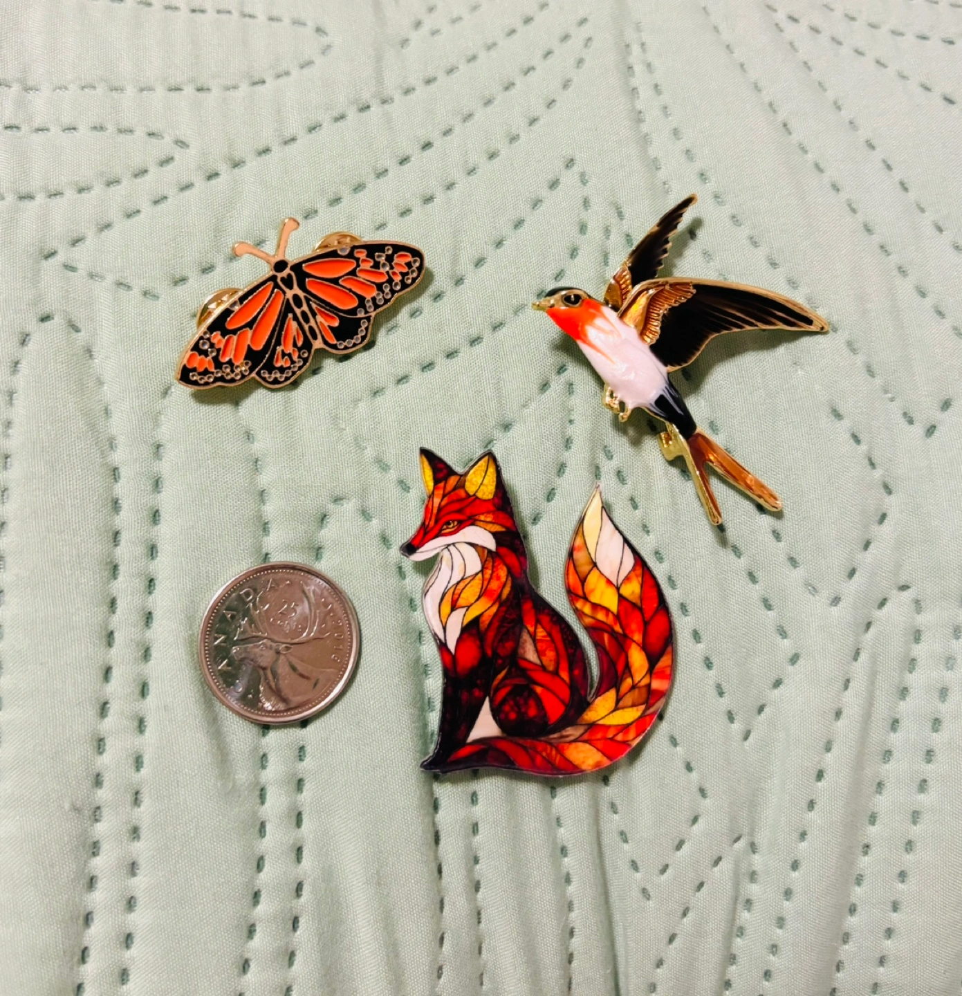 Animal brooches lot. Features a monarch butterfly, a swallow, and a fox. Gold-toned metal accents. (Coin is not included, only for size reference.) Excellent for adding a touch of whimsy to any outfit! 😊