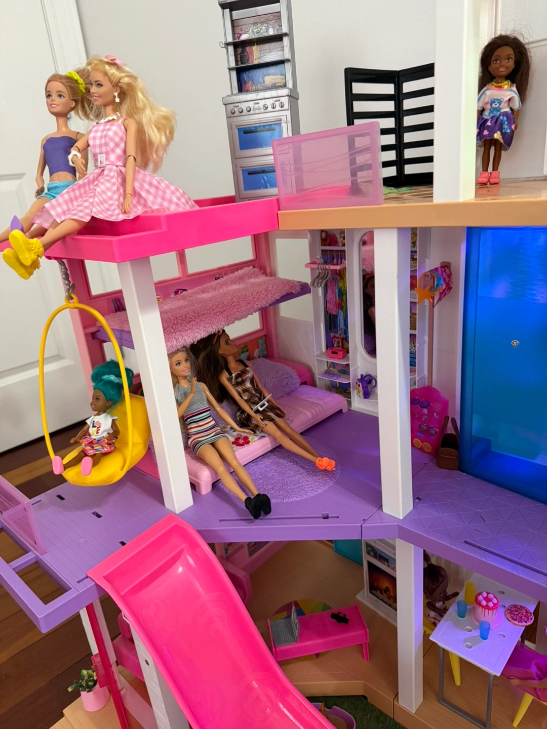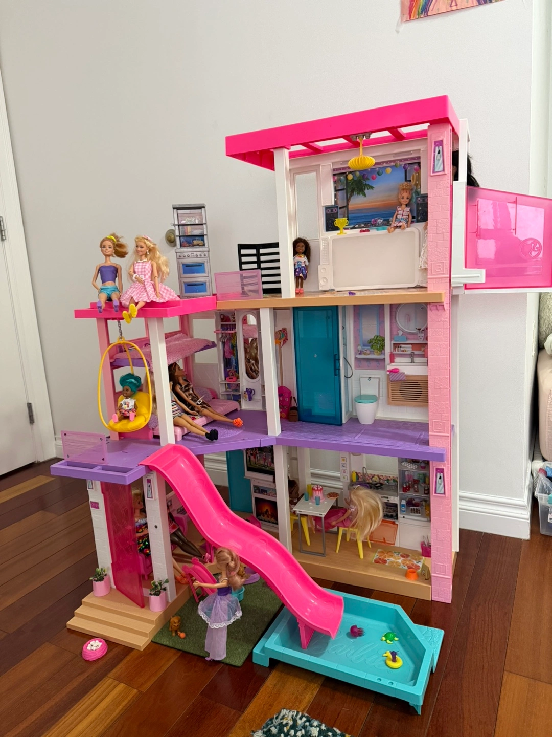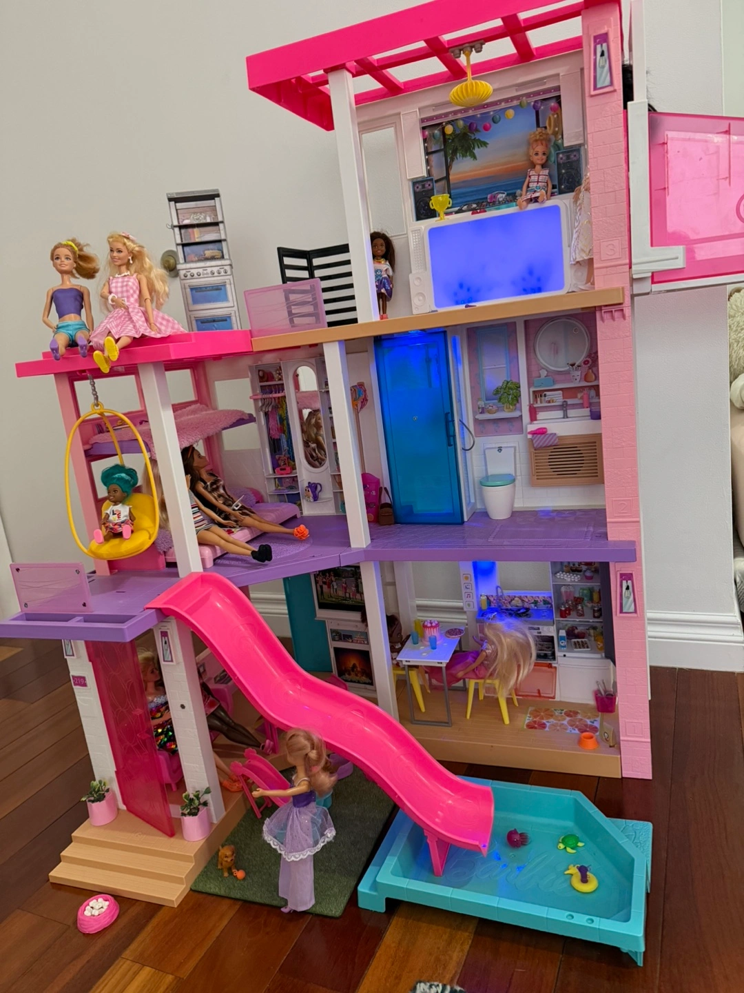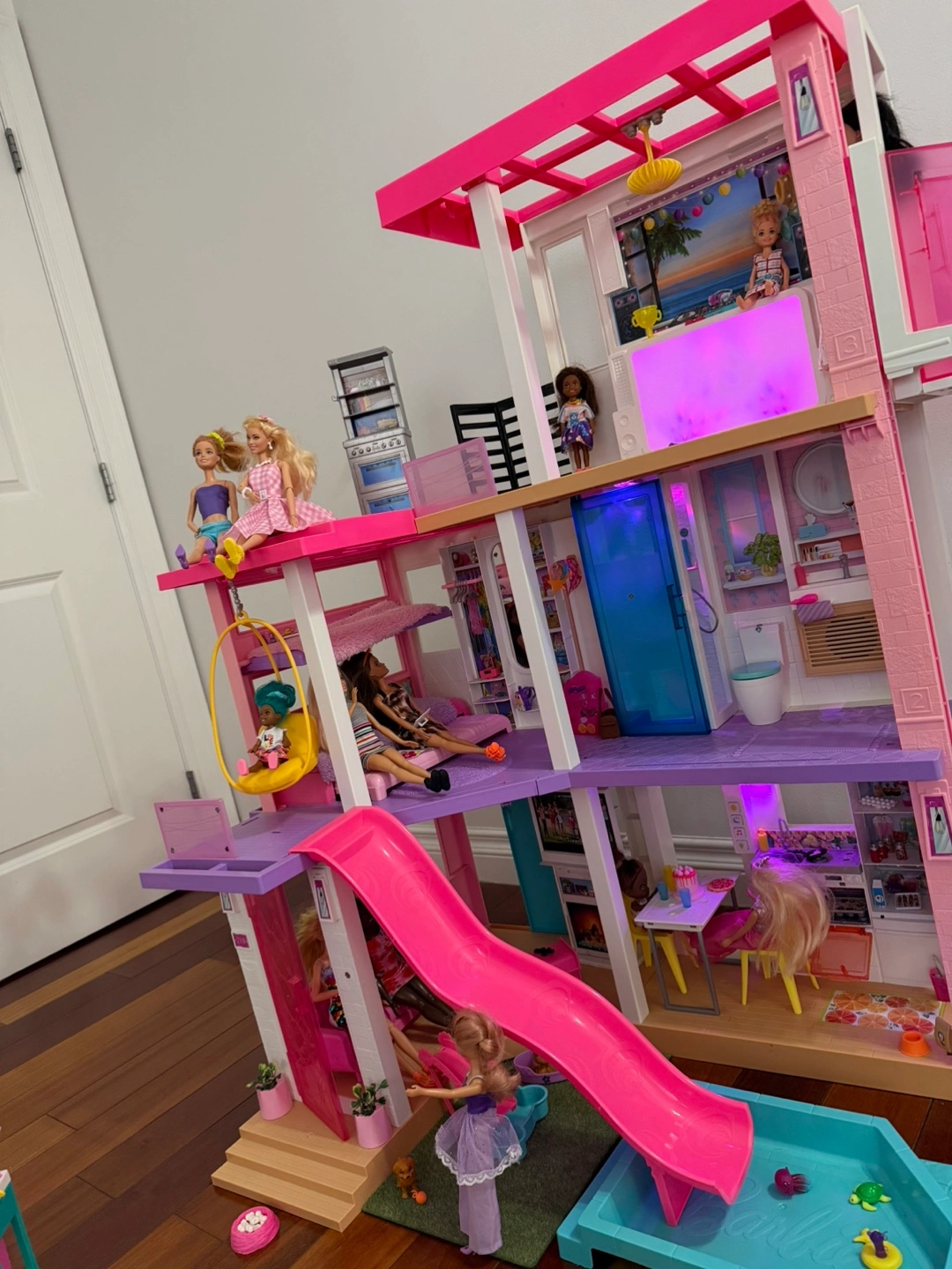 This Barbie Dreamhouse is a multi-level playset with a slide and pool. It comes with various furniture and accessory pieces for hours of imaginative play. Includes multiple Barbie dolls and a pink car.