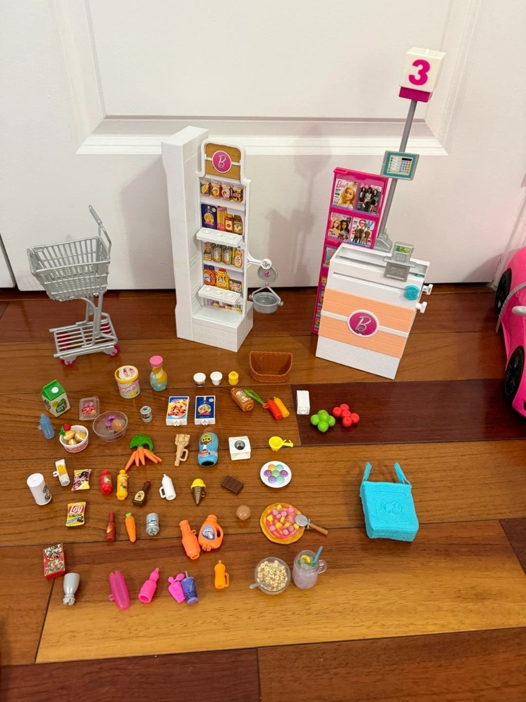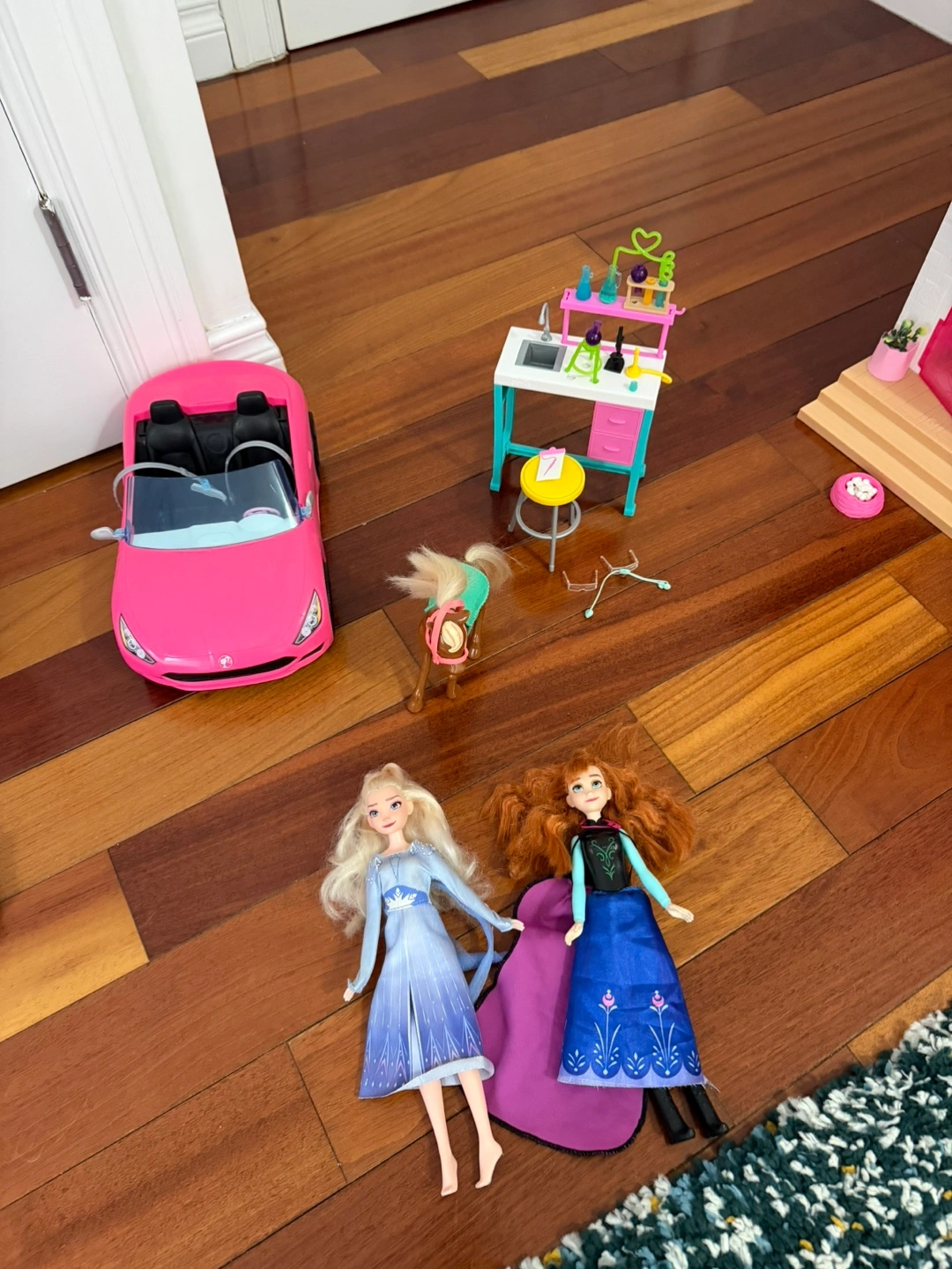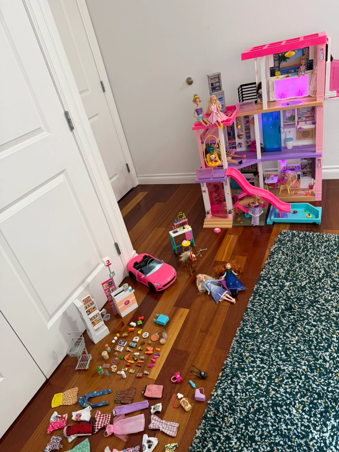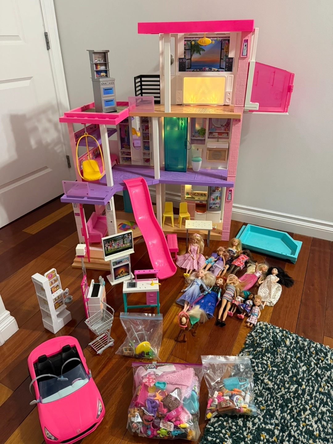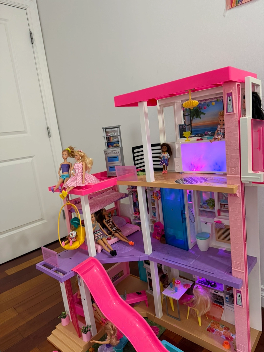 This Barbie Dreamhouse is a multi-level playset with a slide and pool. It comes with various furniture and accessory pieces for hours of imaginative play. Includes multiple Barbie dolls and a pink car.