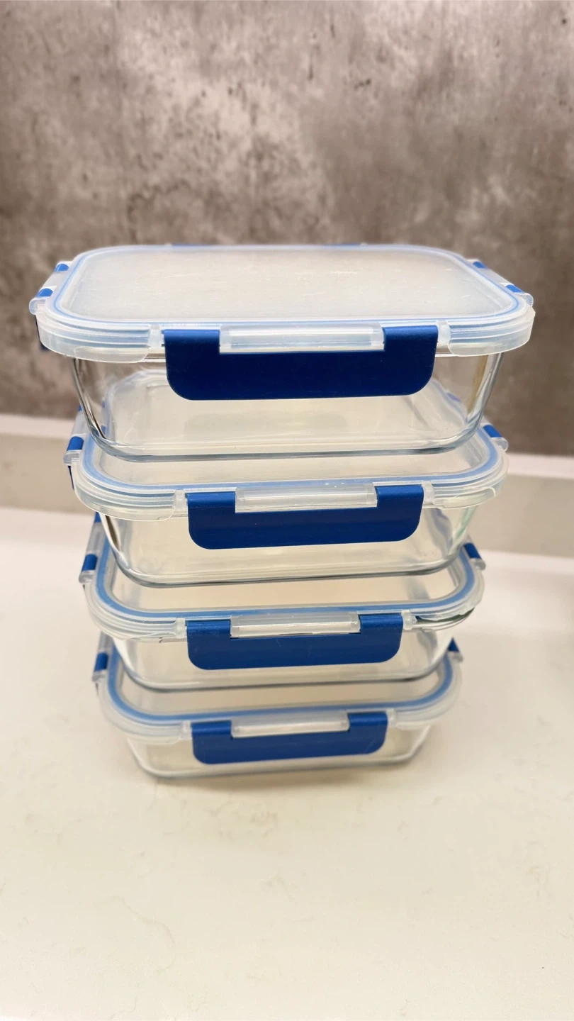 PyrexSet of 4 glass food storage containers with blue locking lids. These are freezer, microwave, and dishwasher safe. They're made from borosilicate glass and feature airtight seals. These containers are great for meal prep or storing leftovers!