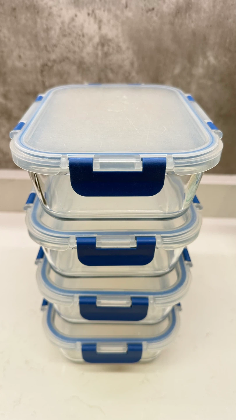 PyrexSet of 4 glass food storage containers with blue locking lids. These are freezer, microwave, and dishwasher safe. They're made from borosilicate glass and feature airtight seals. These containers are great for meal prep or storing leftovers!