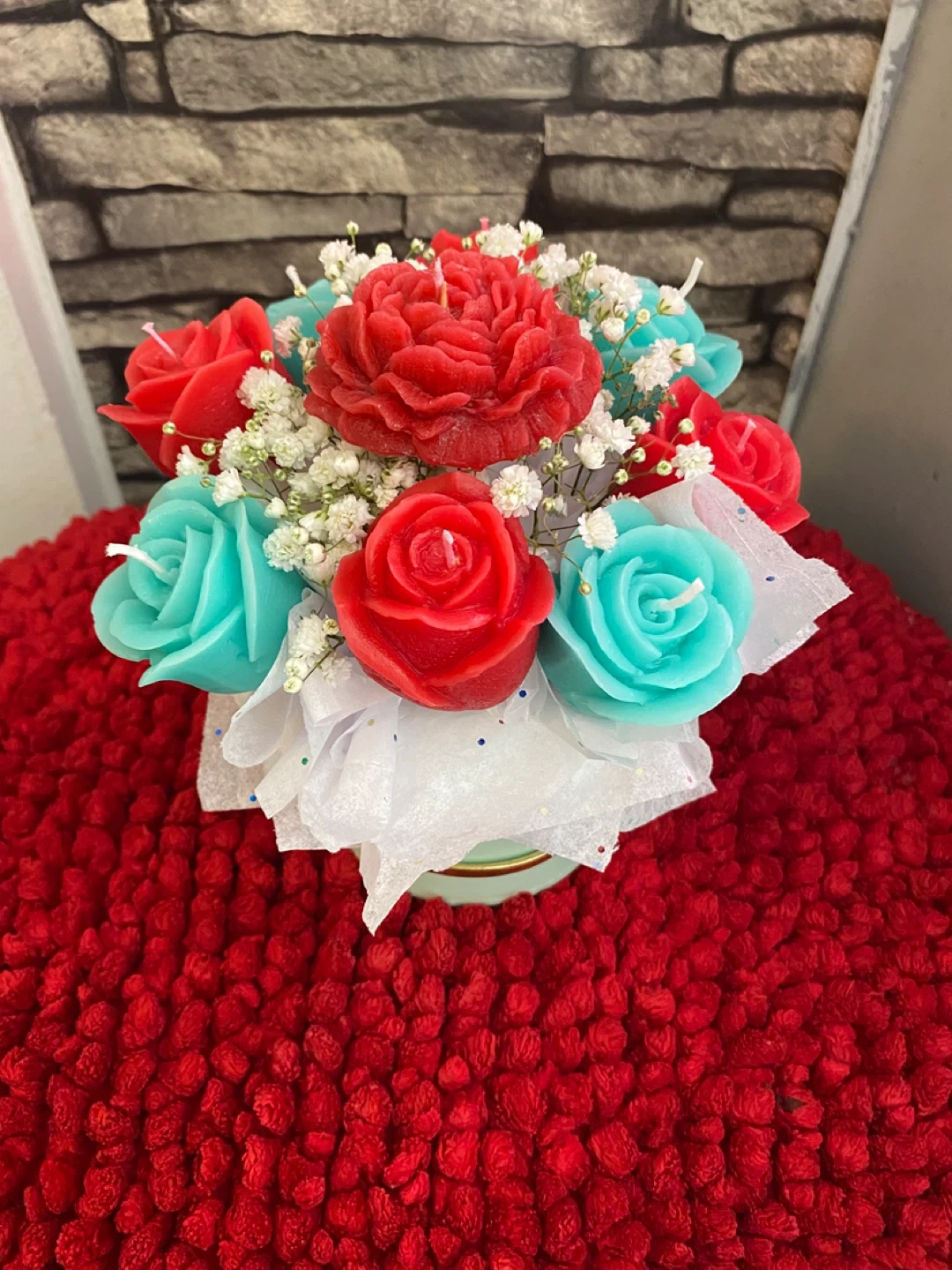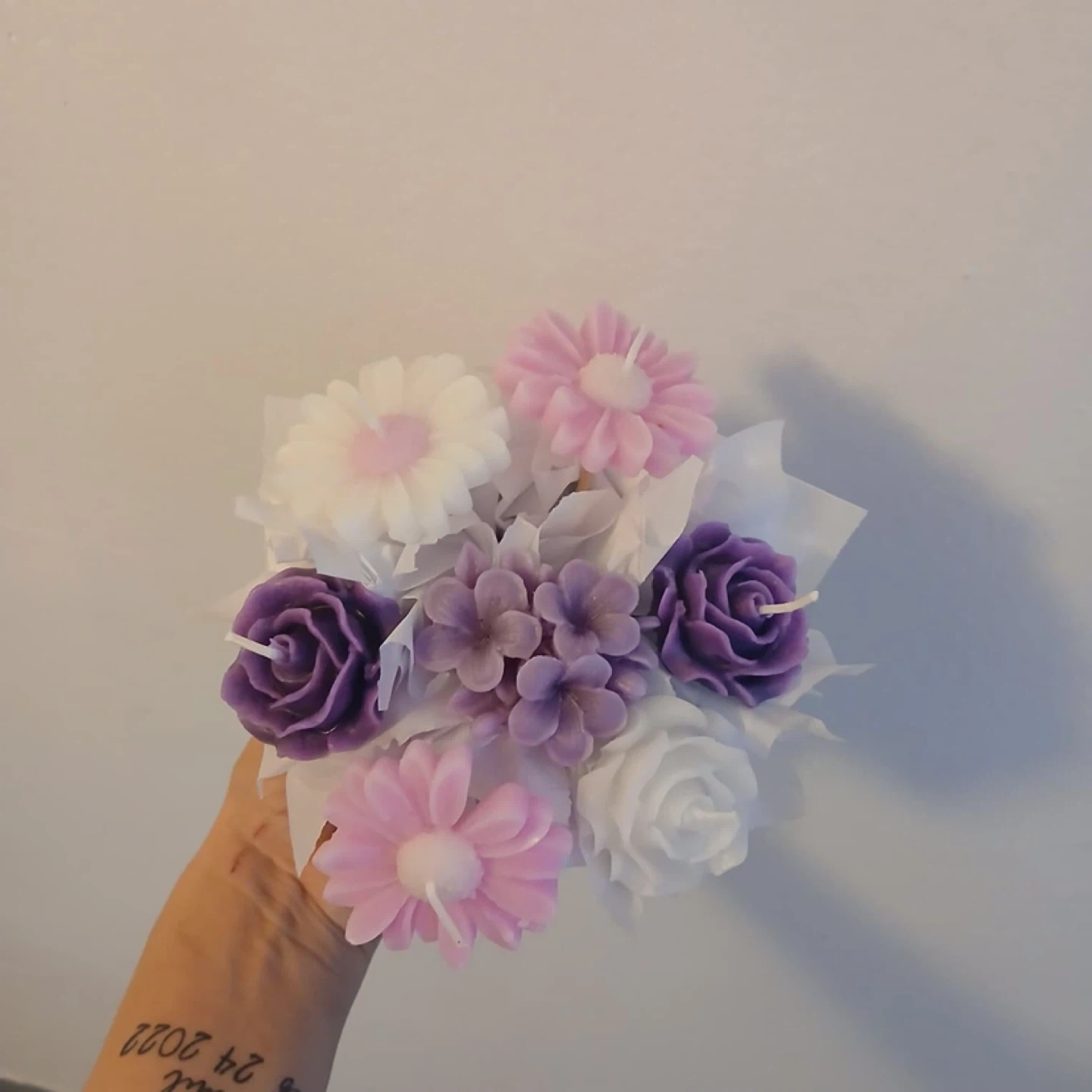 A beautiful bouquet made of handmade scented candles shaped like various flowers. These candles are perfect for adding a decorative touch to any room or for a unique gift. They're made with quality wax and delightful scents.
