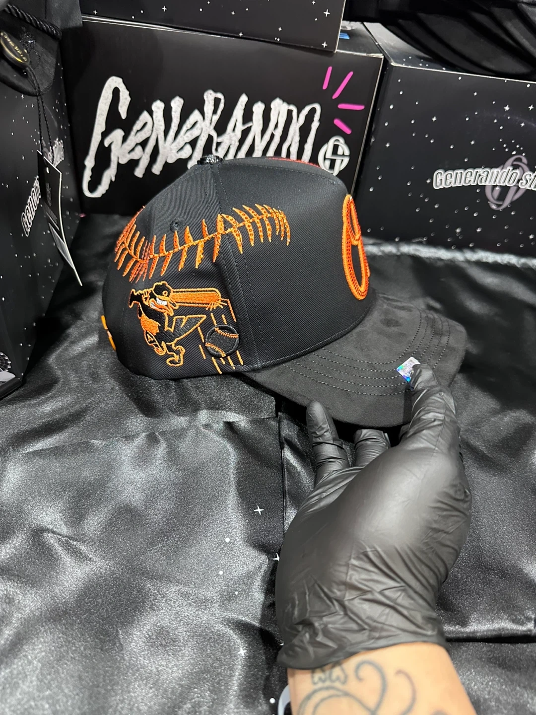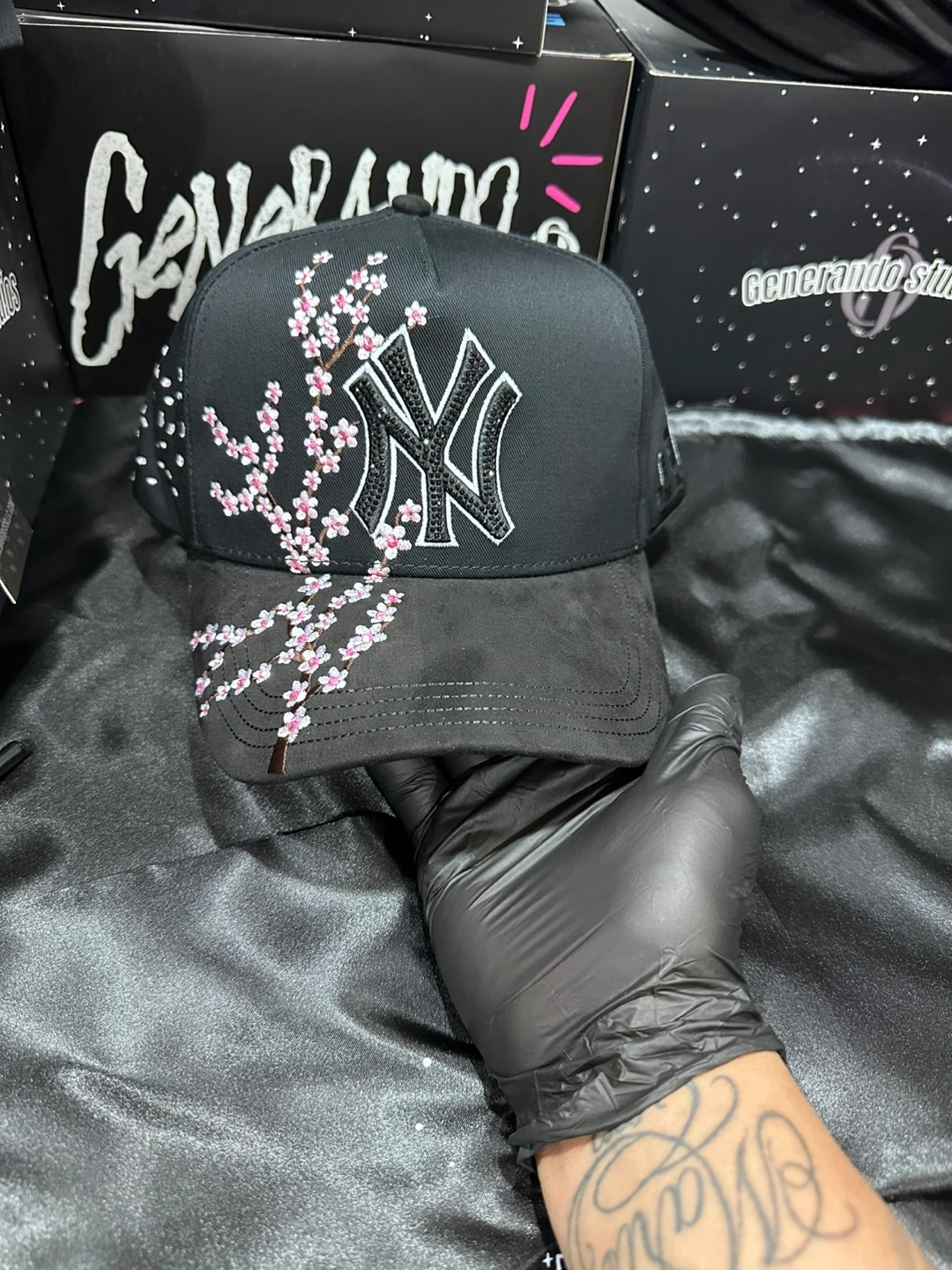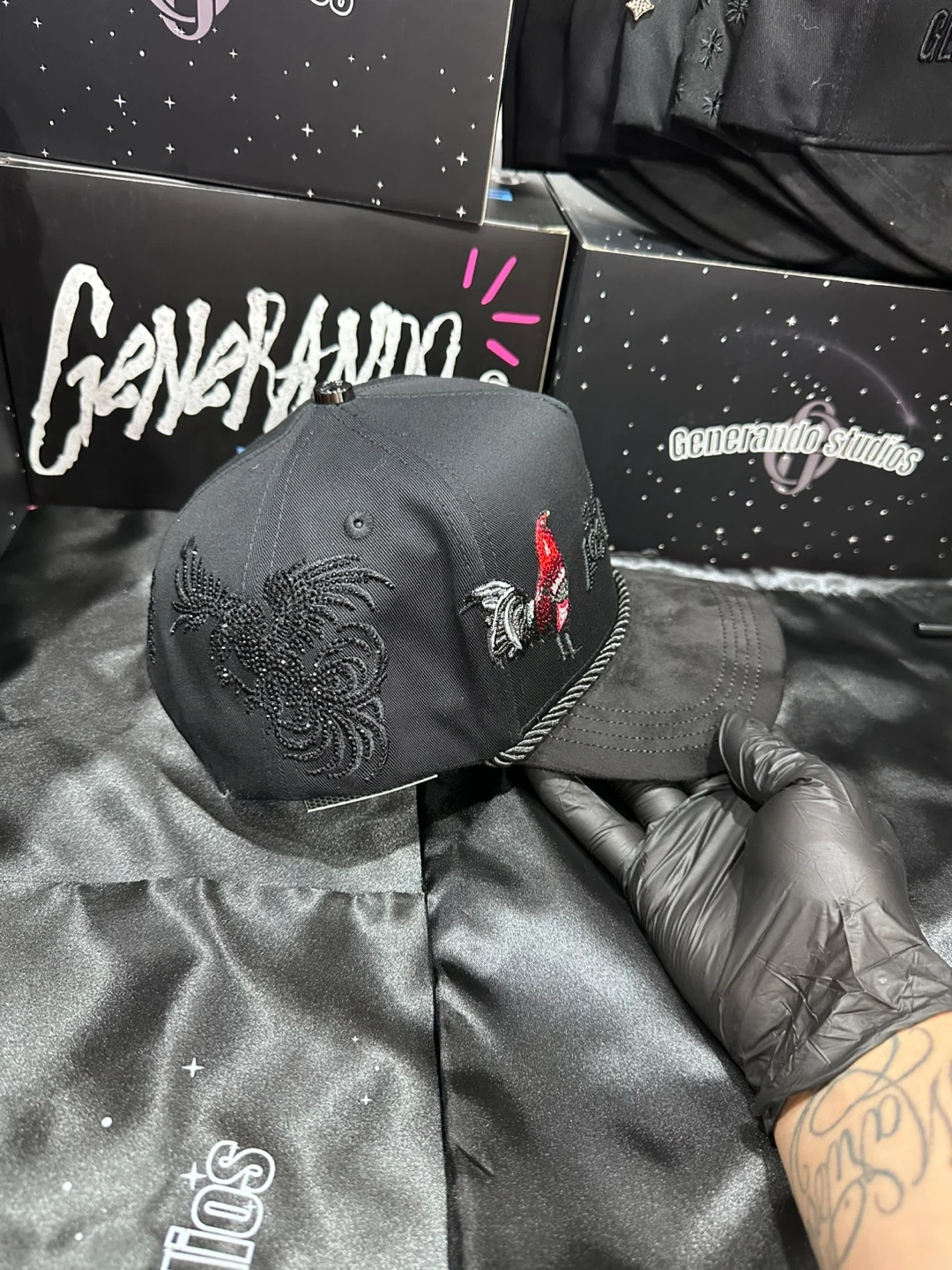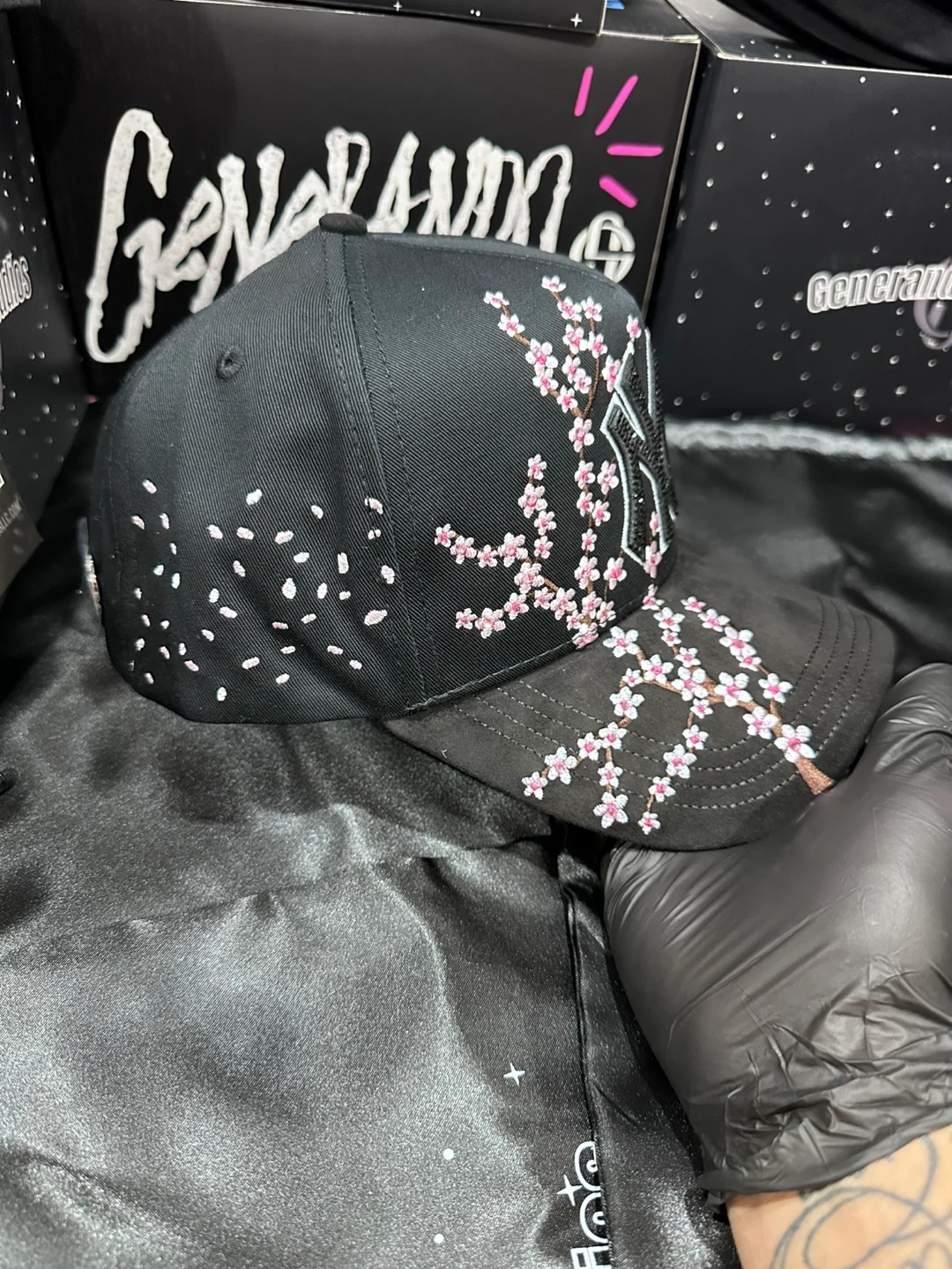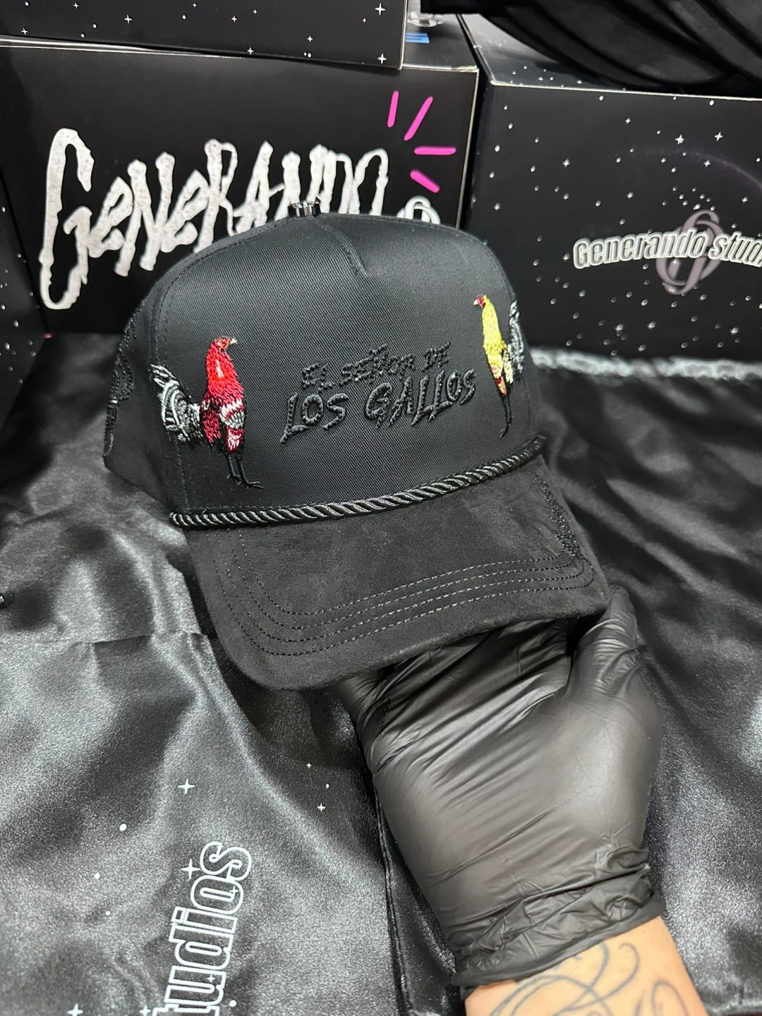 This black trucker hat features detailed embroidery with roosters and cherry blossoms. It has a suede brim and a rope accent. One size fits most.