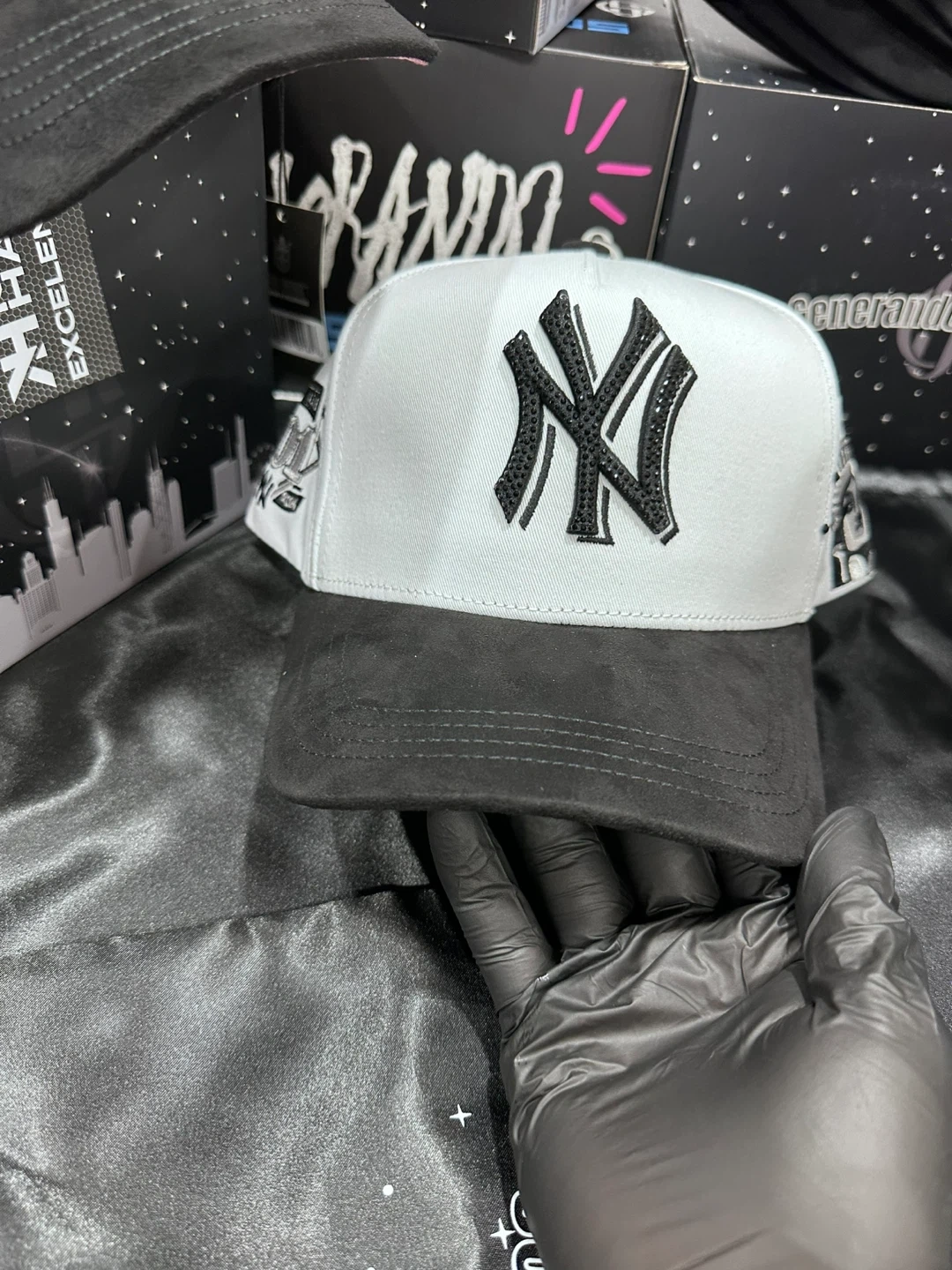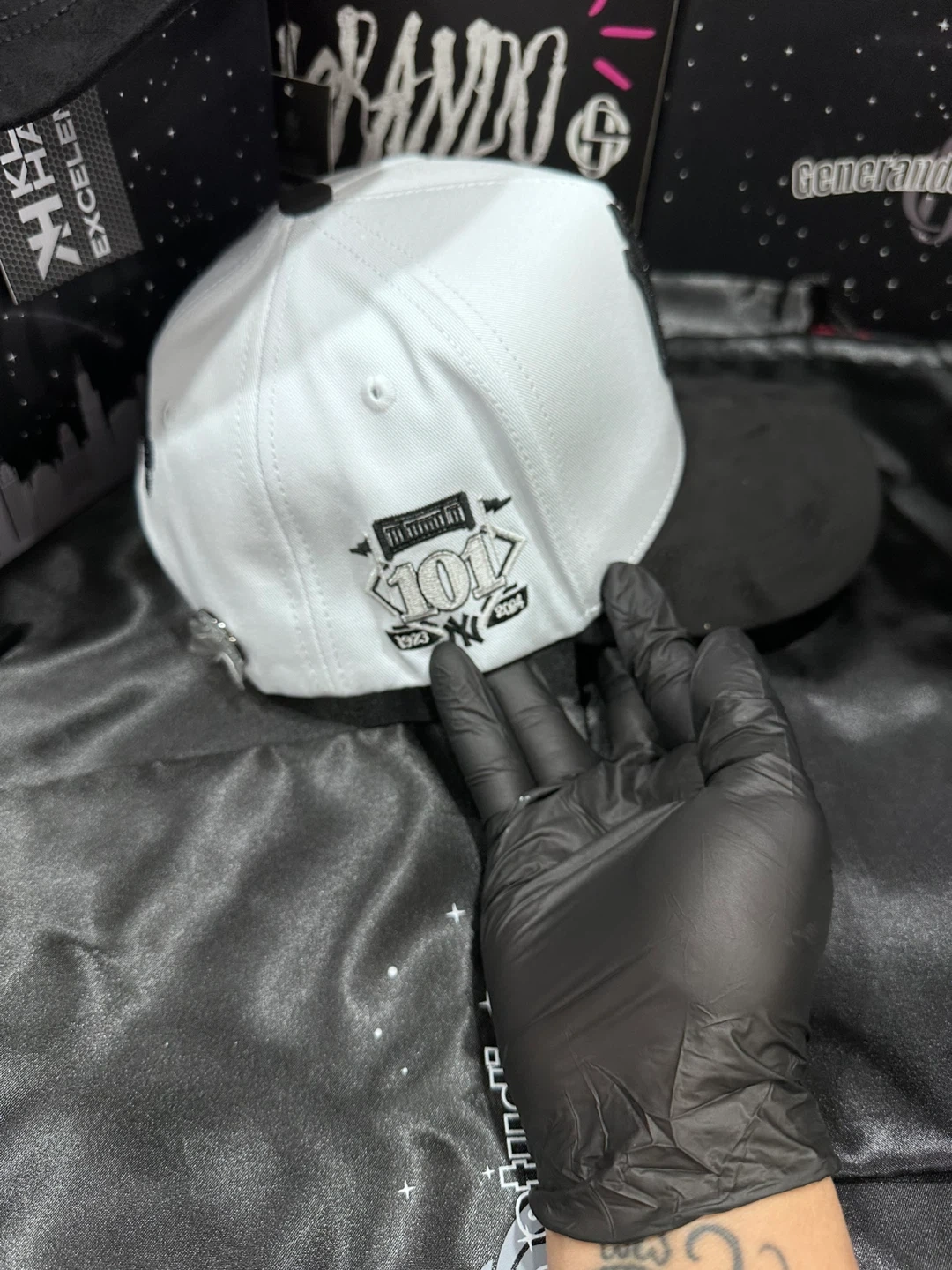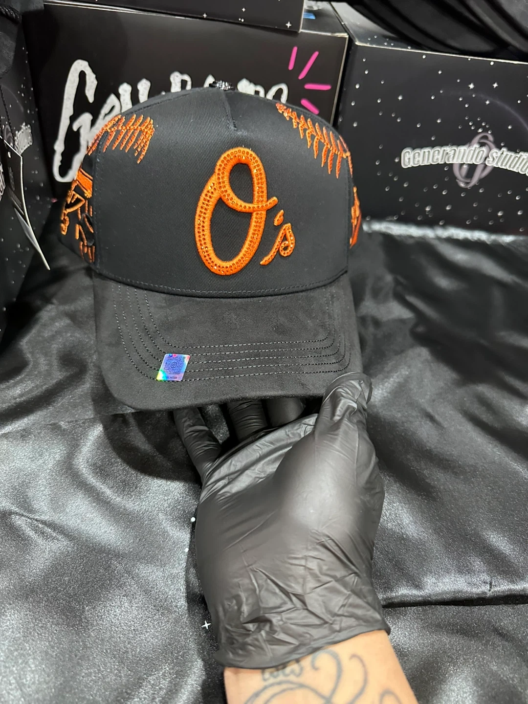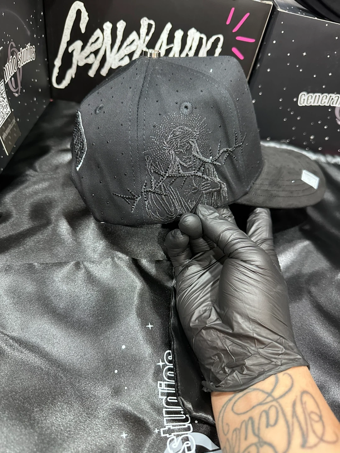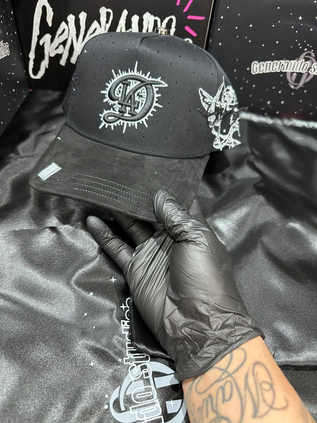 This black trucker hat features detailed embroidery with roosters and cherry blossoms. It has a suede brim and a rope accent. One size fits most.