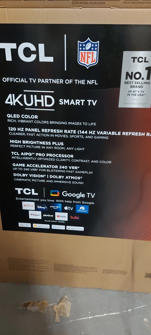TCL 98" Q Class 4K UHD HDR QLED Smart TV with Google TV – 98Q671G *4K UltraHD Resolution *QLED PRO – Quantum Dot Technology *High Brightness+ LED Backlight *120Hz Refresh Rate (144 Variable Refresh Rate) *TCL AIPQ PRO Processor with Deep Learning AI *HDR PRO+ with Dolby Vision, HDR10+, HDR10, & HLG *Motion Rate 480 with *MEMC Frame Insertion *Game Accelerator 240 Auto Game Mode (ALLM) *Dolby Atmos Audio *Built-In Subwoofer *Enhanced Dialogue Mode DTS Virtual:X *Bluetooth Personal Audio *3 HDMI Inputs including one with eARC Wi-Fi 5 *Google TV Smart OS with Hands-Free Voice Control and Backlit Voice Remote *Google Chromecast Built-in *Apple Airplay2 Works with: Amazon Alexa, Google Assistant, Apple HomeKit NEW with WARRANTY EASY FINANCING AVAILABLE