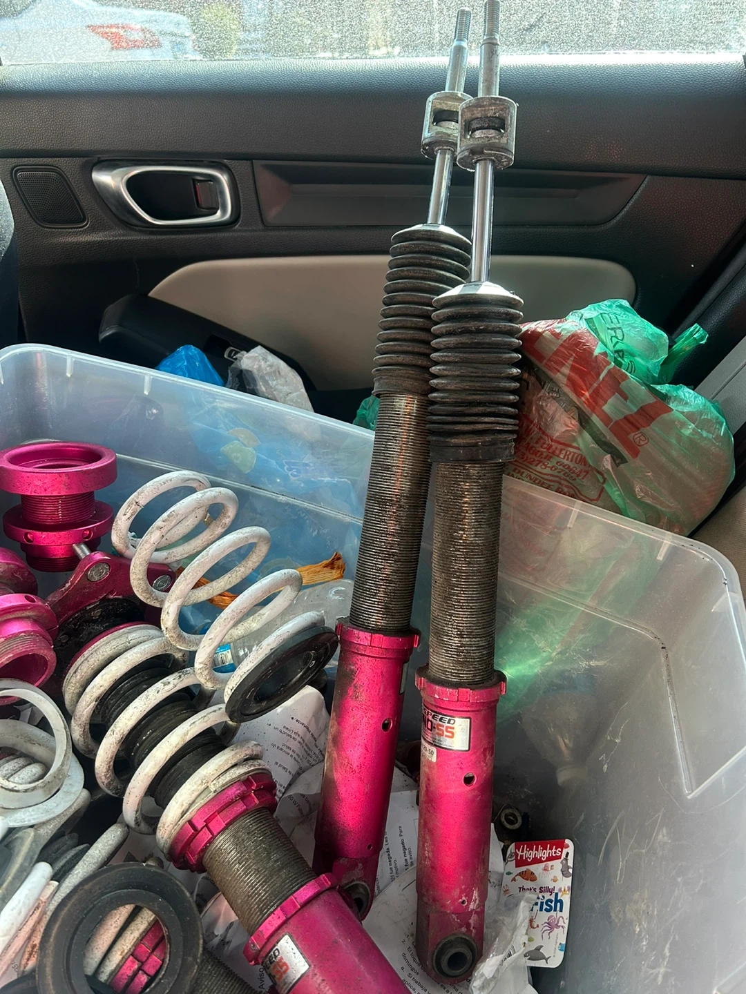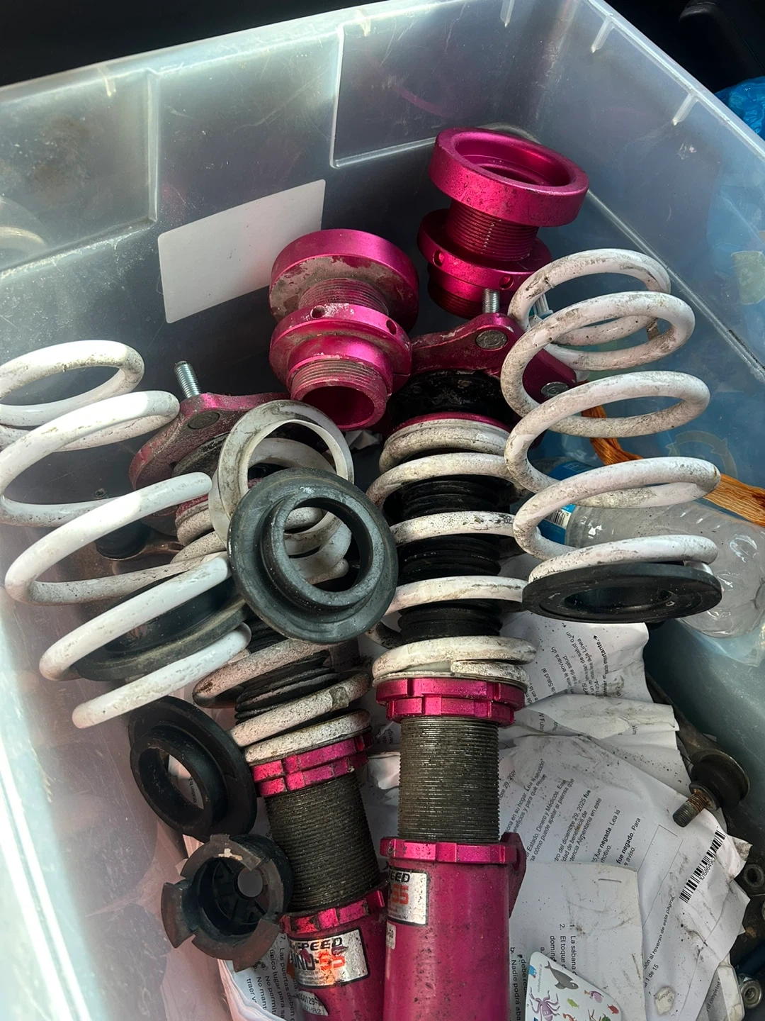 Vendo o canbio Set of coilover suspension parts and springs. Includes multiple spring sets and adjustable shock absorbers. Some parts are pink, others are silver and black. They're designed for performance upgrades.