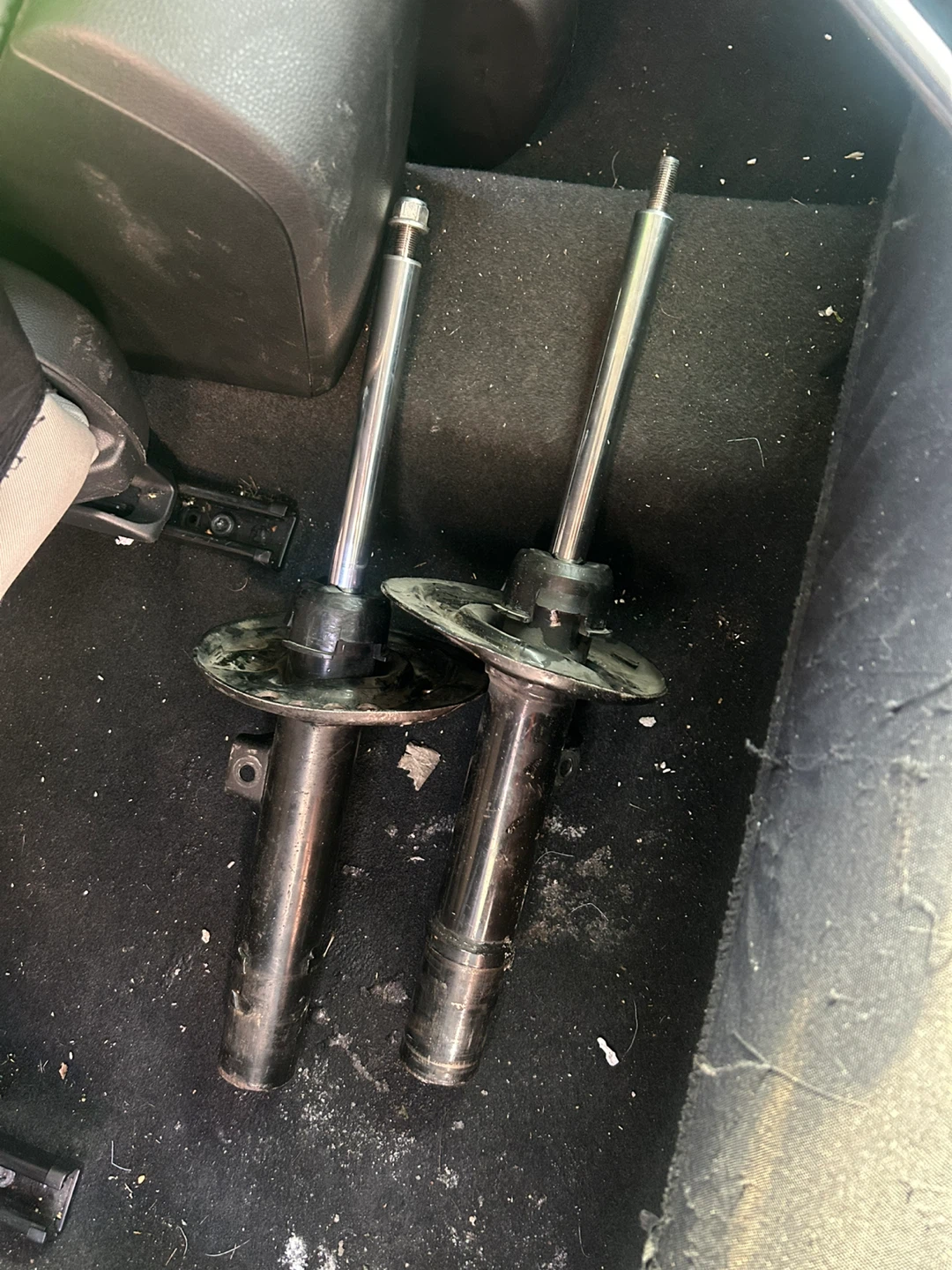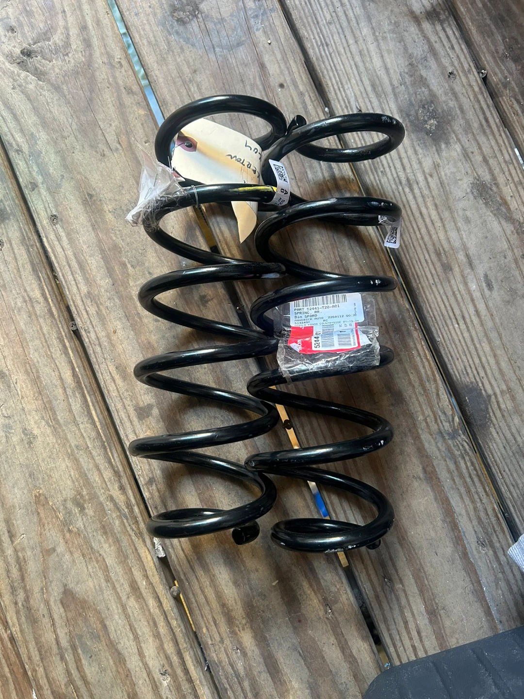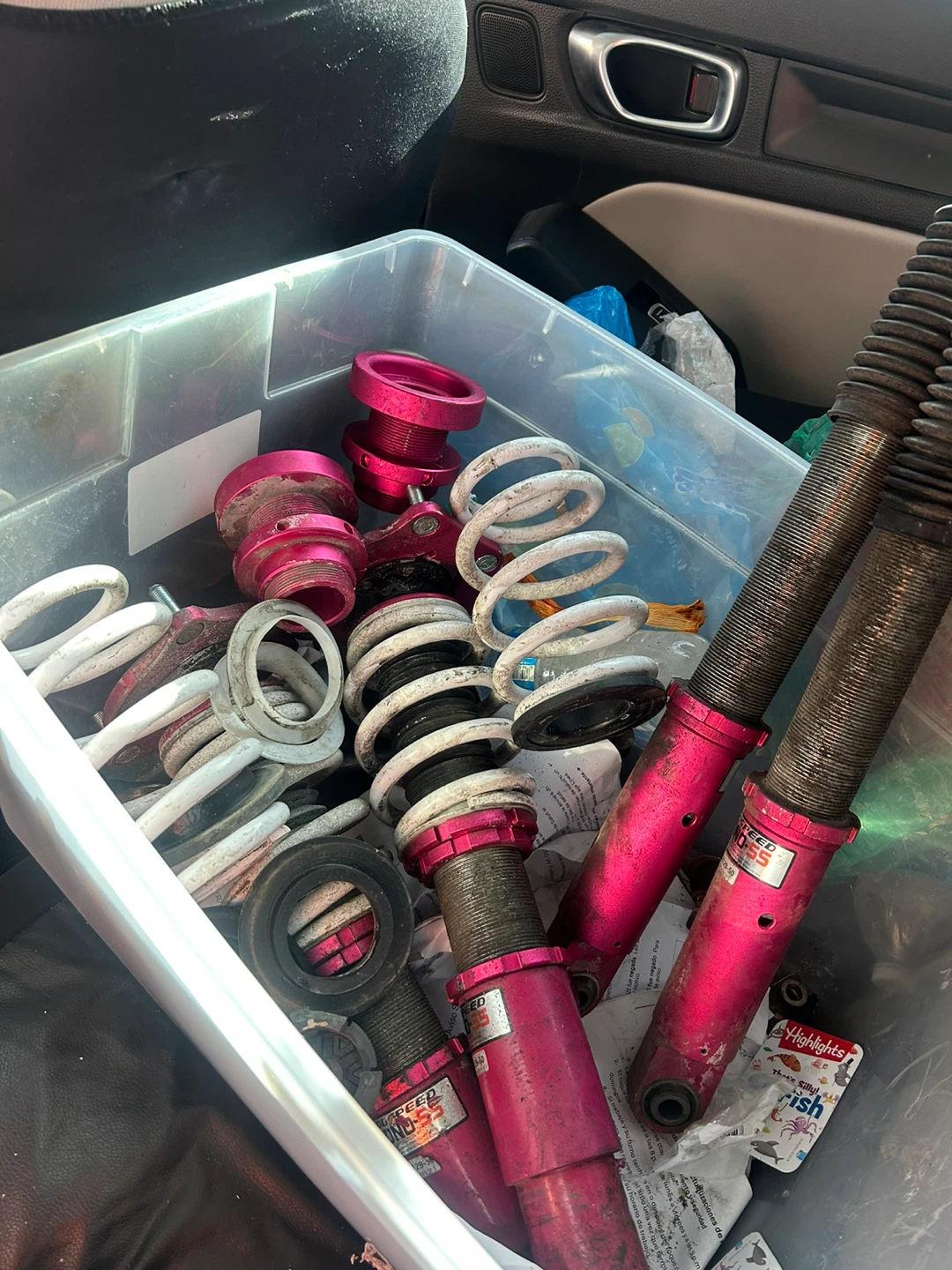 Vendo o canbio Set of coilover suspension parts and springs. Includes multiple spring sets and adjustable shock absorbers. Some parts are pink, others are silver and black. They're designed for performance upgrades.