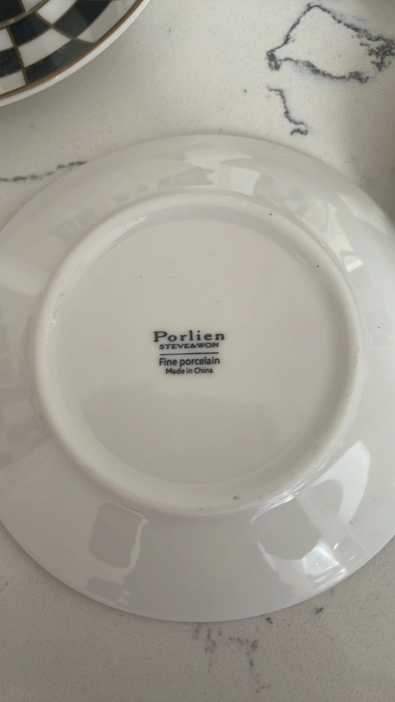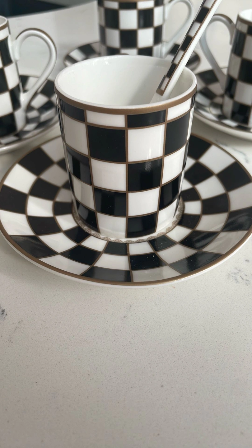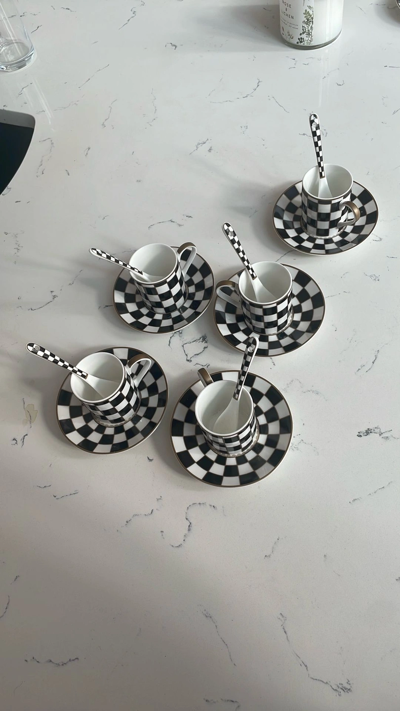 65Set of 5. Pick up in Williamsburg. Color: Checkered/ Black/ White/ Gold Trim Material: Porcelain Brand: Porlien