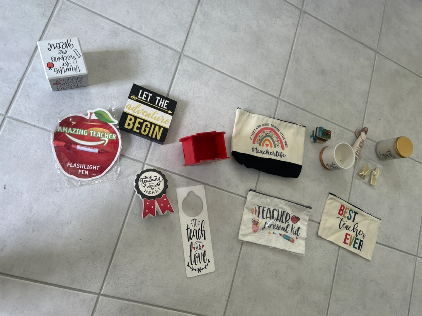 A collection of teacher-themed items, including decorative pieces, pouches, and accessories, perfect for showing appreciation to educators 1.00 2.00. 3.00.
