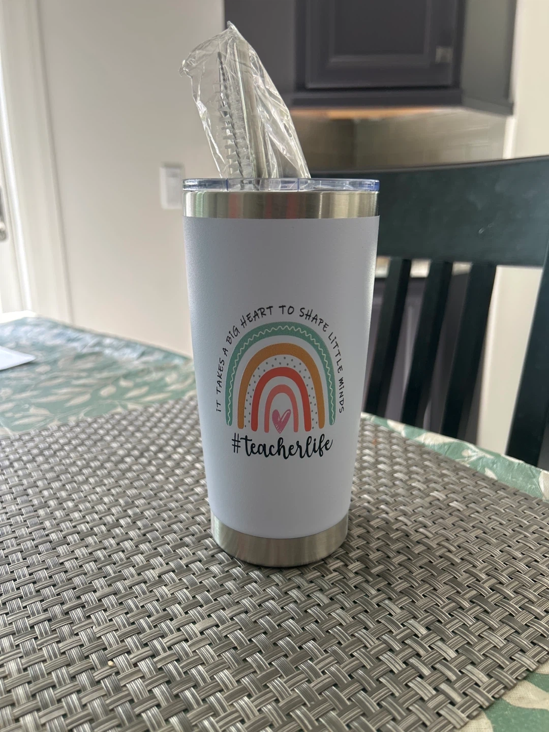 I'm selling a cute tumbler with a straw! It has a fun design that says '#teacherlife' and 'It takes a big heart to shape little minds' with a rainbow. The other side says 'Chaos coordinator' with a funny definition. Perfect for any teacher! New 10.00 great gift