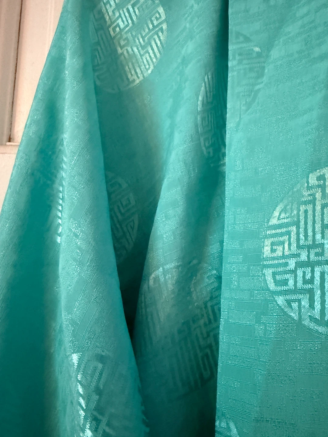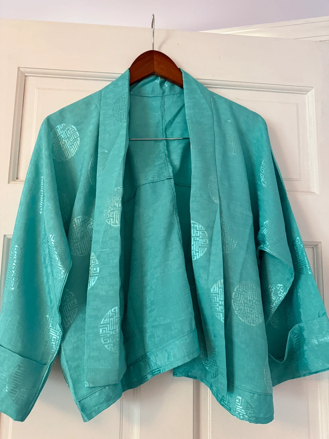 Selling a teal cropped honjo .It has a unique pattern throughout. It would be a great addition to your wardrobe!🥕