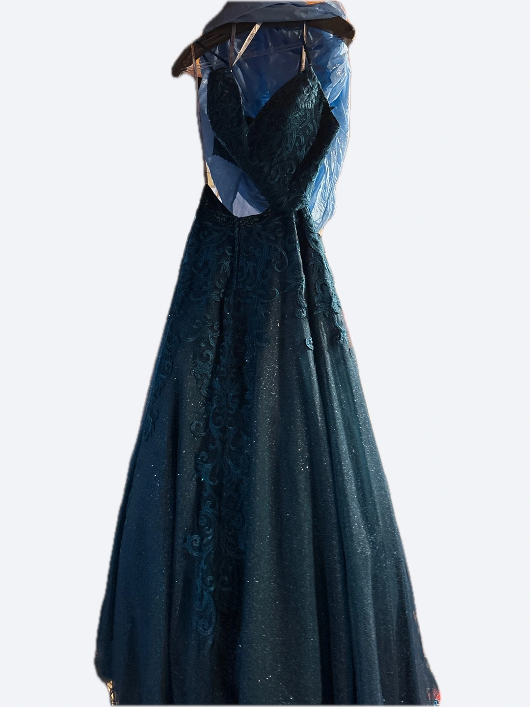 5Selling a beautiful teal formal dress with intricate embellishments. It's in great condition and ready for your special occasion! The dress features a fitted bodice and a flowing skirt, making it perfect for a prom or evening event