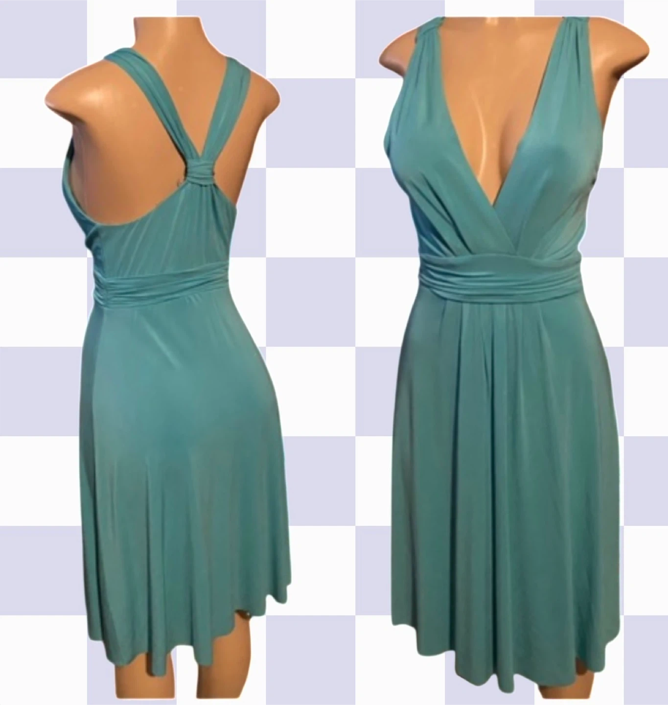 65Selling a teal-colored dress with a flattering V-neck design! The dress features a cinched waist and a unique strap detail on the back. It's in great condition and perfect for a night out or a special occasion