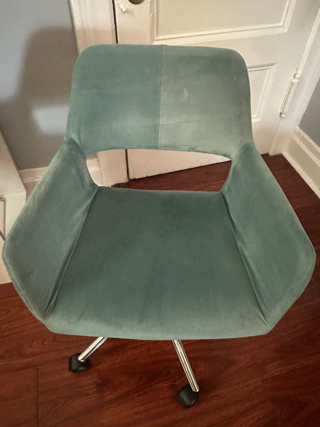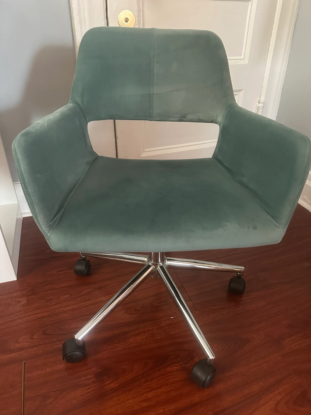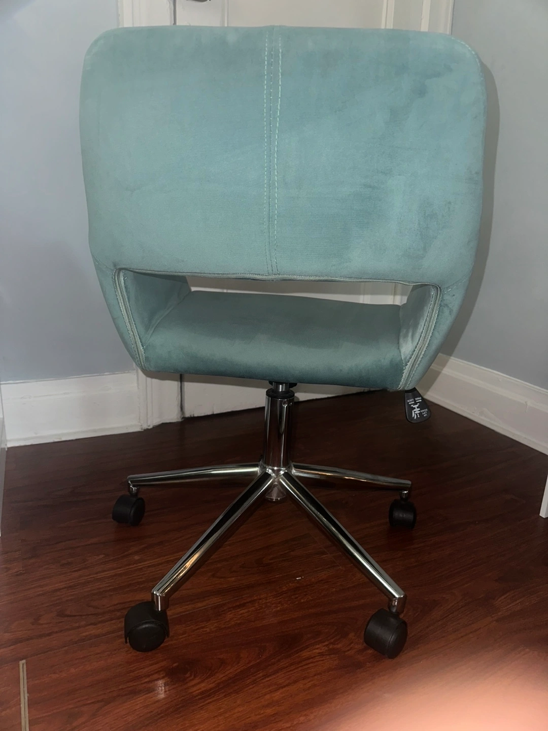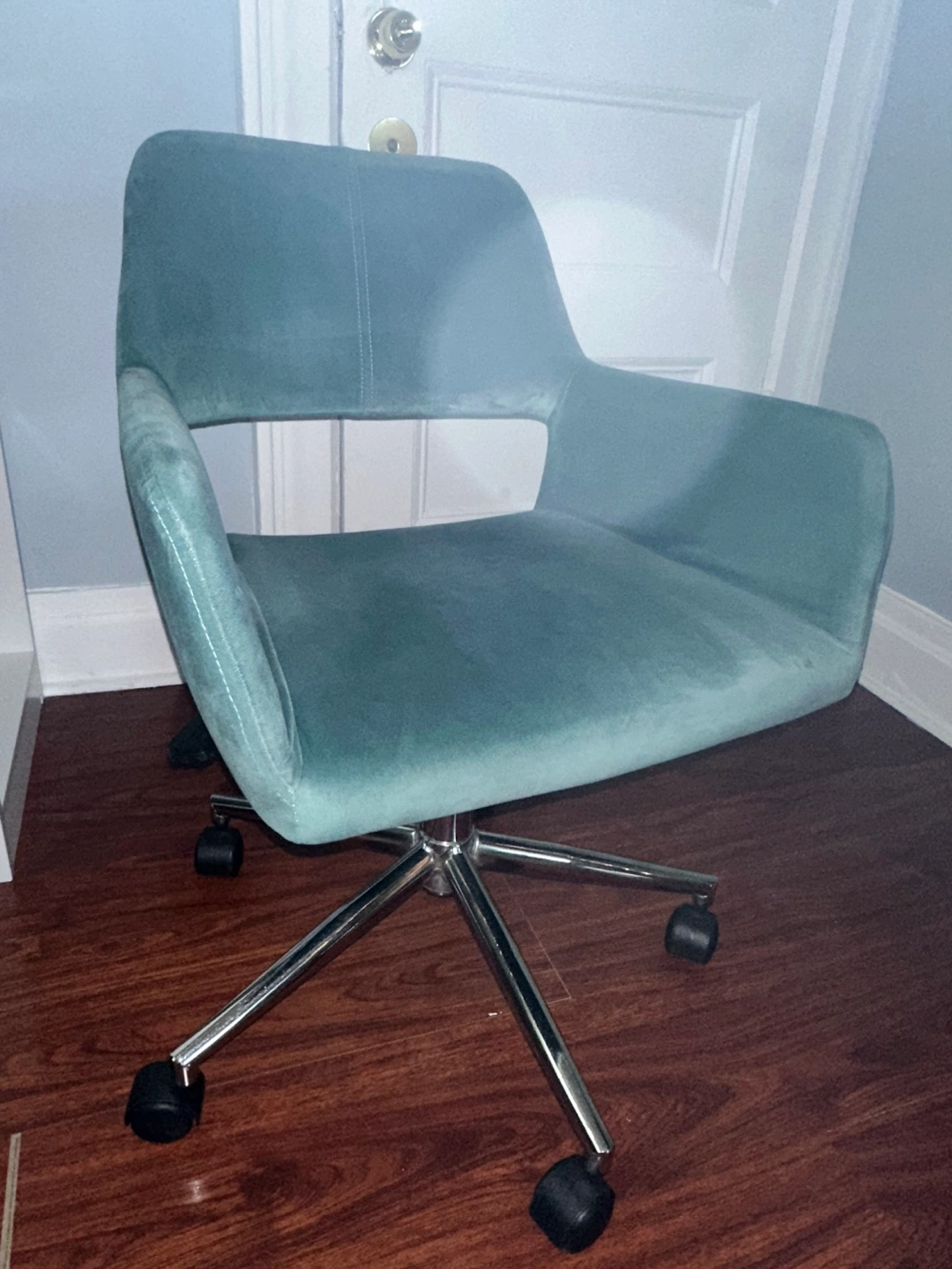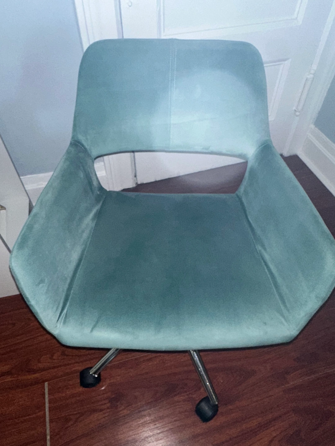 Swivel, rolling office chair in teal/aqua velvet. Features a chrome base and five wheels. Comfortable and modern design. Perfect for home office or small space.
