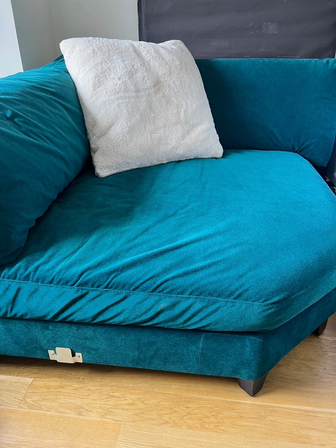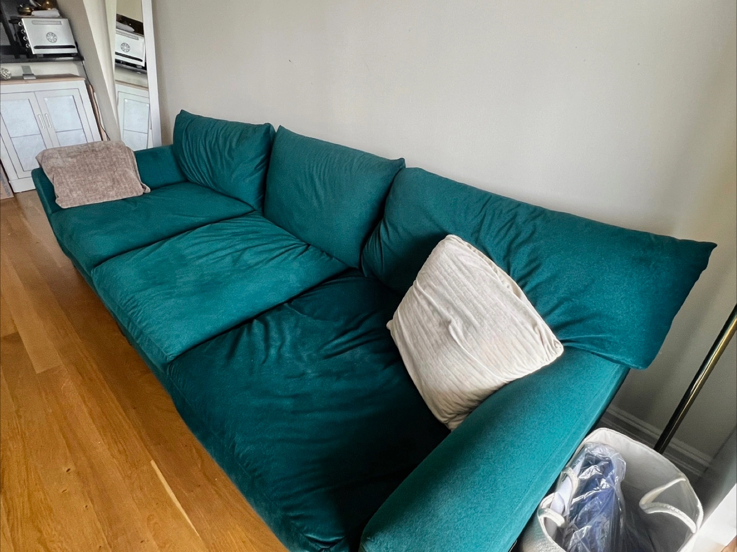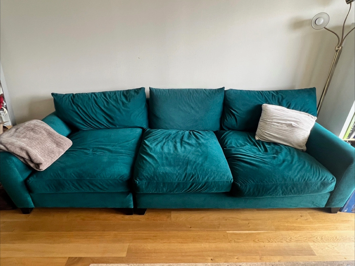 This is a Johnathan Louis customized sectional. It has 4 seats, and can comfortably seat 3-5 people. we have currently split it into a 3 piece sofa and a reading nook. Can be put back together like the model pictured in last photo. Dimensions- 106x42x29 inches ( LxWxH) It comes with 3 pillows- 2 big white fur pillows and 1 orange It has deep seats, so guest can sleep on it as well Cushions are feather based, and covers can be removed and washed. Org. Price- $3500