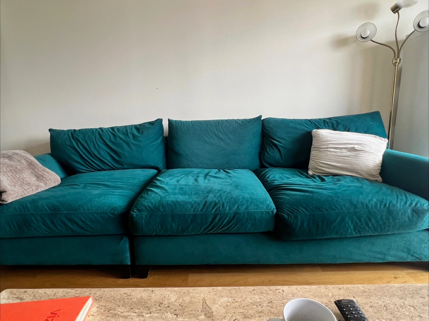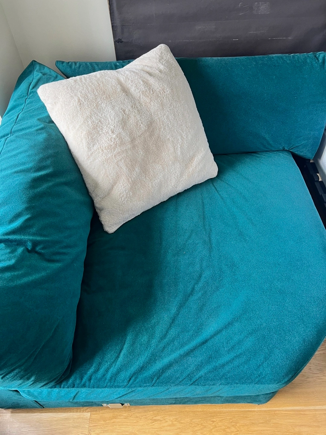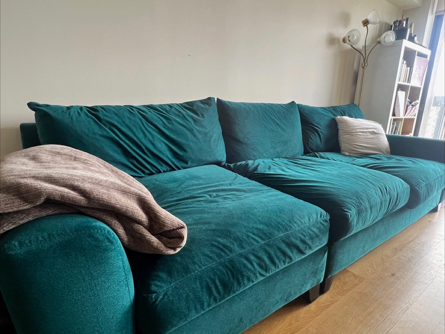 This is a Johnathan Louis customized sectional. It has 4 seats, and can comfortably seat 3-5 people. we have currently split it into a 3 piece sofa and a reading nook. Can be put back together like the model pictured in last photo. Dimensions- 106x42x29 inches ( LxWxH) It comes with 3 pillows- 2 big white fur pillows and 1 orange It has deep seats, so guest can sleep on it as well Cushions are feather based, and covers can be removed and washed. Org. Price- $3500