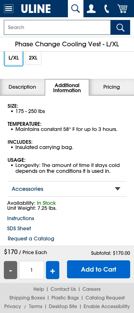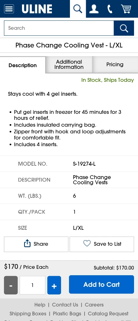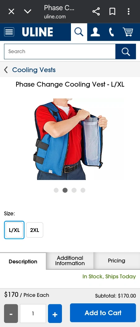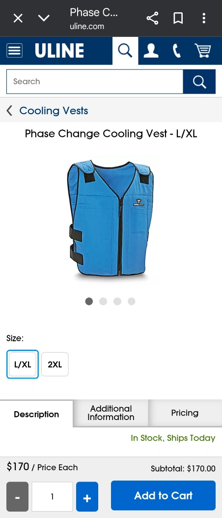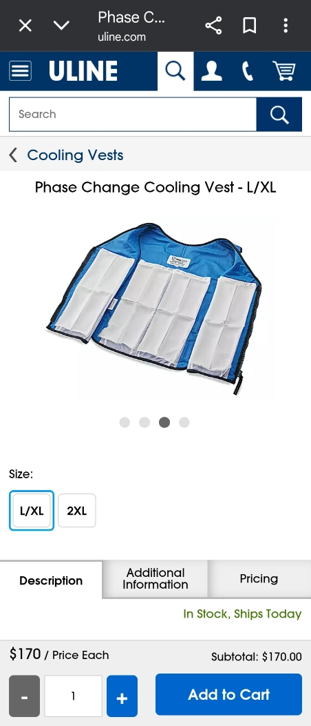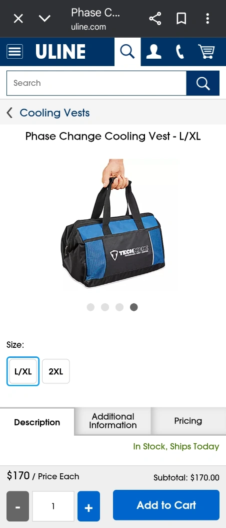 163I'm selling a TechNiche Phase Change Cooling Vest in size L/XL. It comes with an insulated carrying bag and 4 gel inserts. Just put the gel inserts in the freezer for 45 minutes for 3 hours of relief. It also features a zipper front with hook and loop adjustments for a comfortable fit. Originally bought for $170
