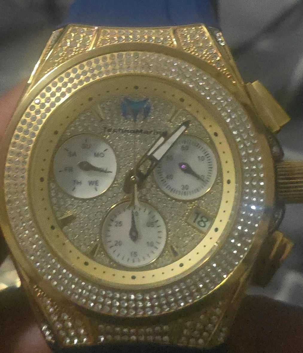 60Selling a gold Techno Pave watch. It features a chronograph dial and is adorned with sparkling accents around the bezel and band. The watch appears to be in good condition.