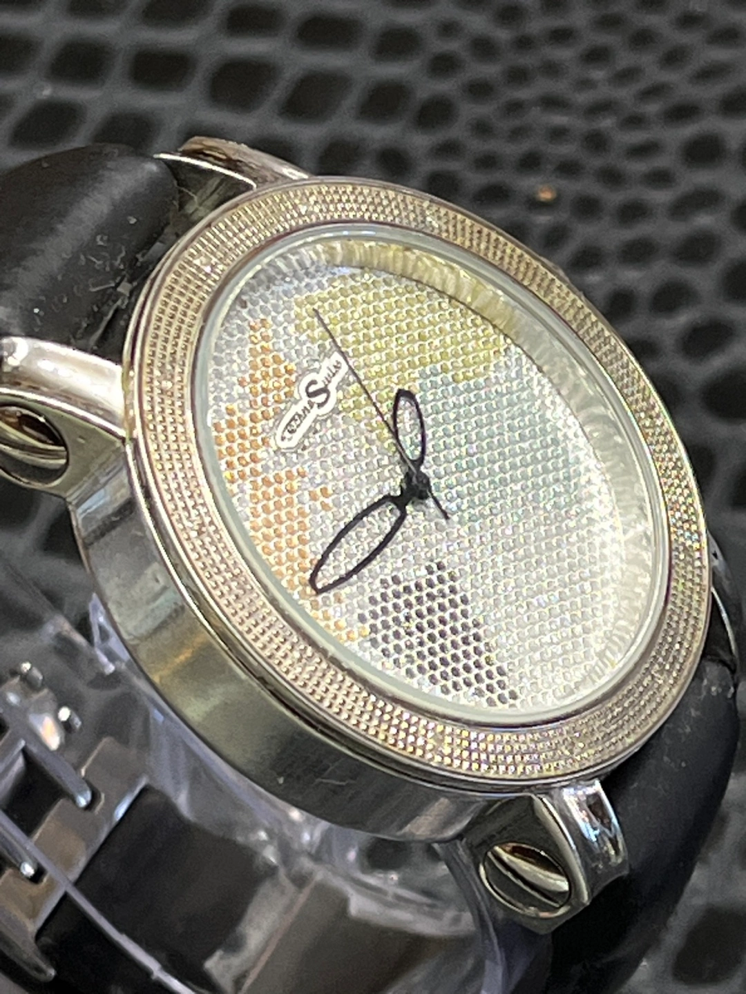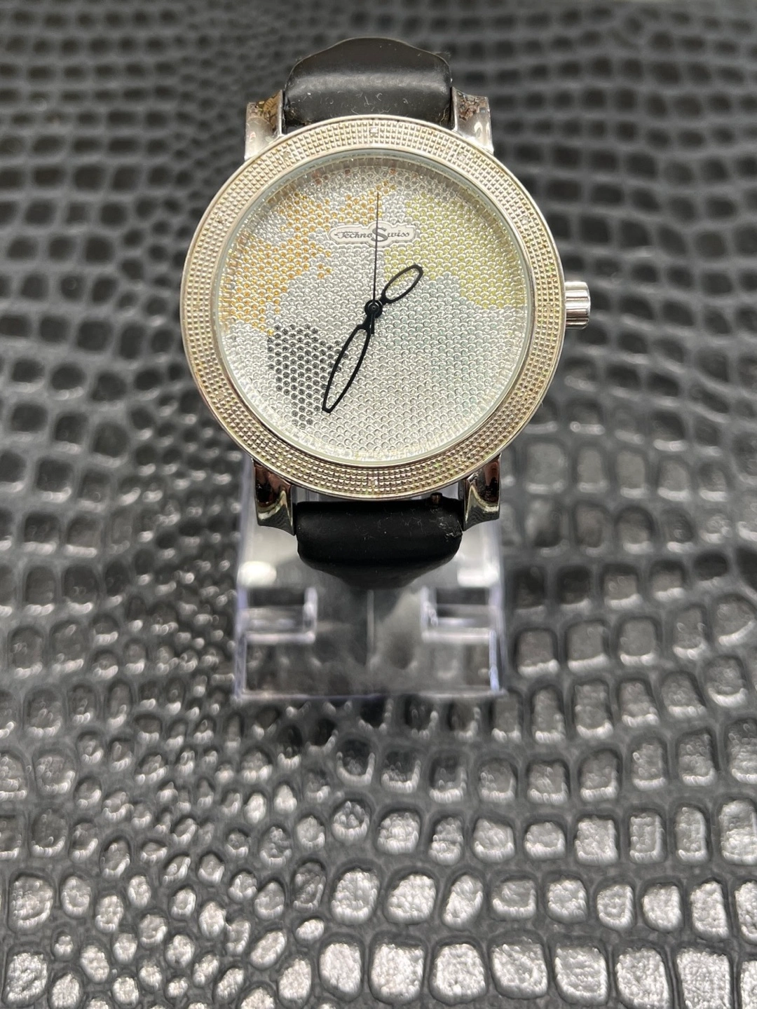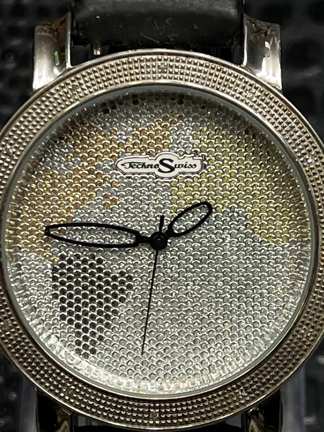 297Techno Swiss watch. Black leather band. Silver face. Crystal accents. Round face.
