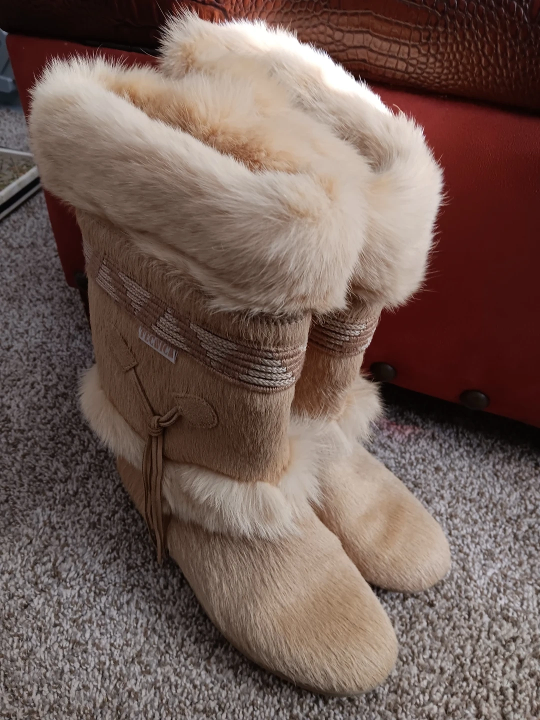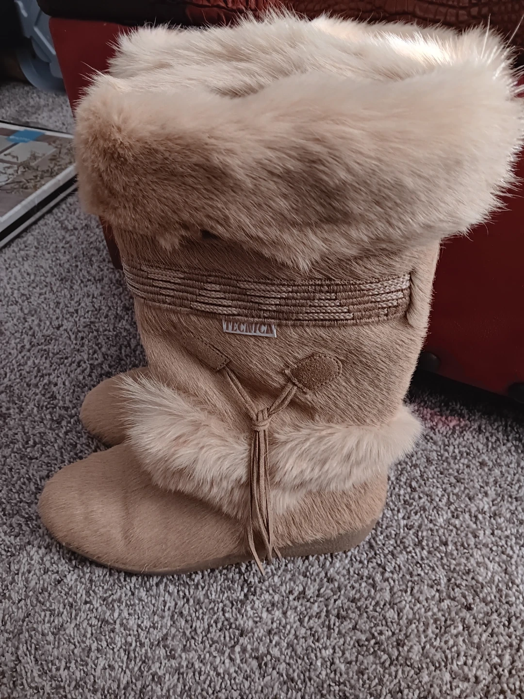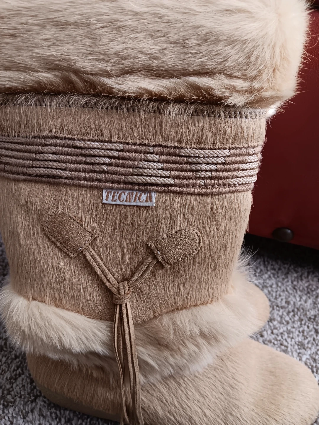 60These Tecnica winter boots are perfect for keeping your feet warm and stylish during the cold months. They have a unique fur design and are in good condition. They are a light tan color. Made with real goat fur, retail 200$-300. Size 7