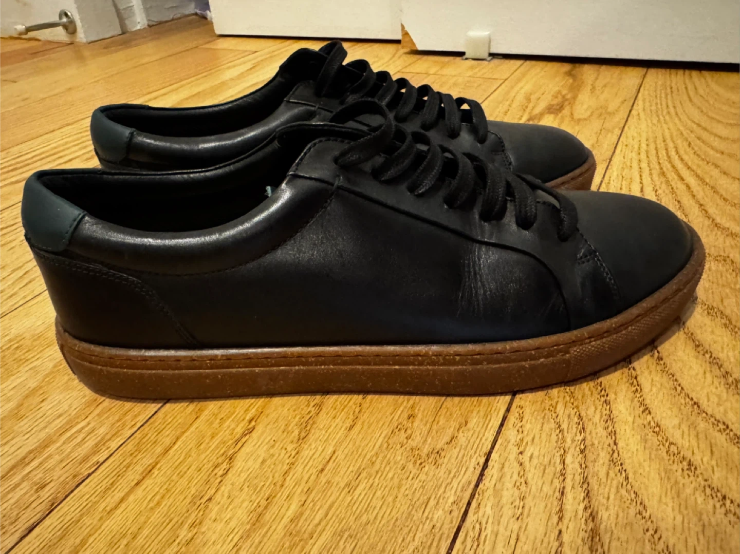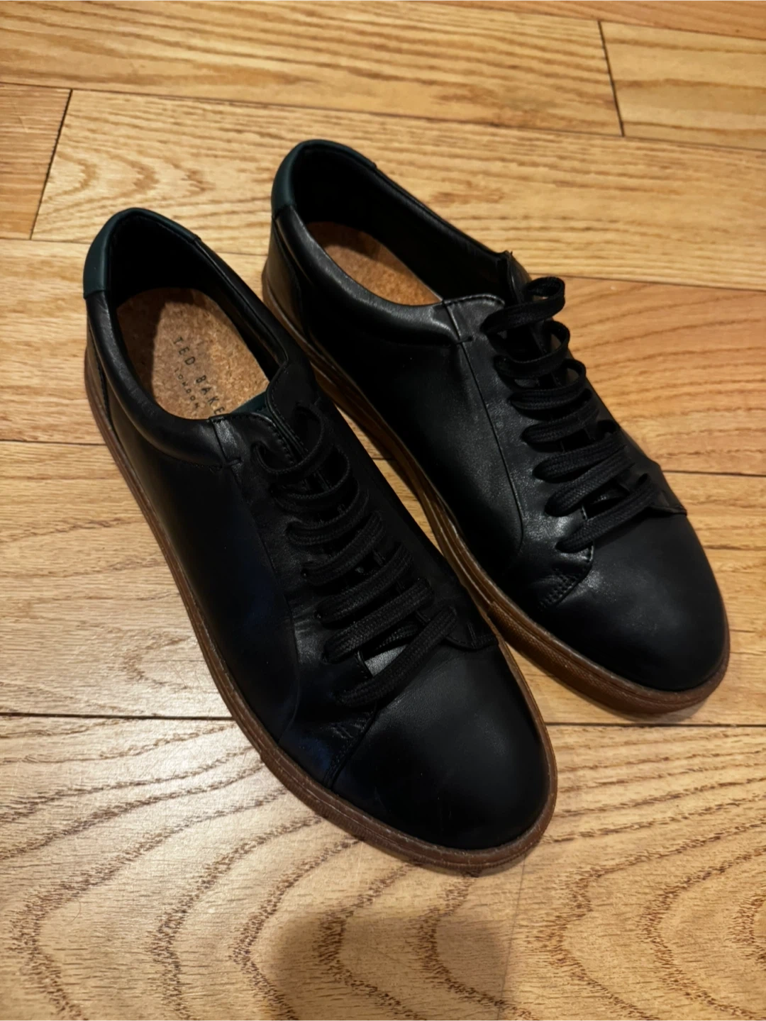 10Selling a pair of Ted Baker black leather sneakers. They feature a unique cork insole and a contrasting brown sole. These shoes are in great condition and have only been worn twice. Size 10, men’s USA sizing.