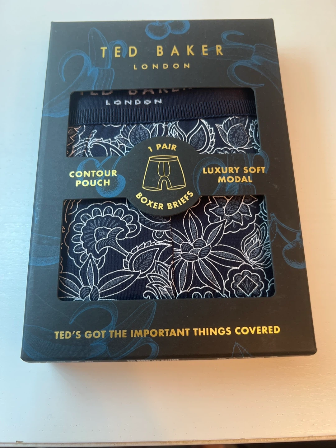 45Selling a brand new pair of Ted Baker London boxer briefs, size medium! They're still in the original box. The briefs are made of 90% modal and 10% elastane, making them lightweight and silky soft. They also feature a luxury no-roll waistband and contour double layer pouch. Style #RTBM113, Color RENFREW. Retails for $34