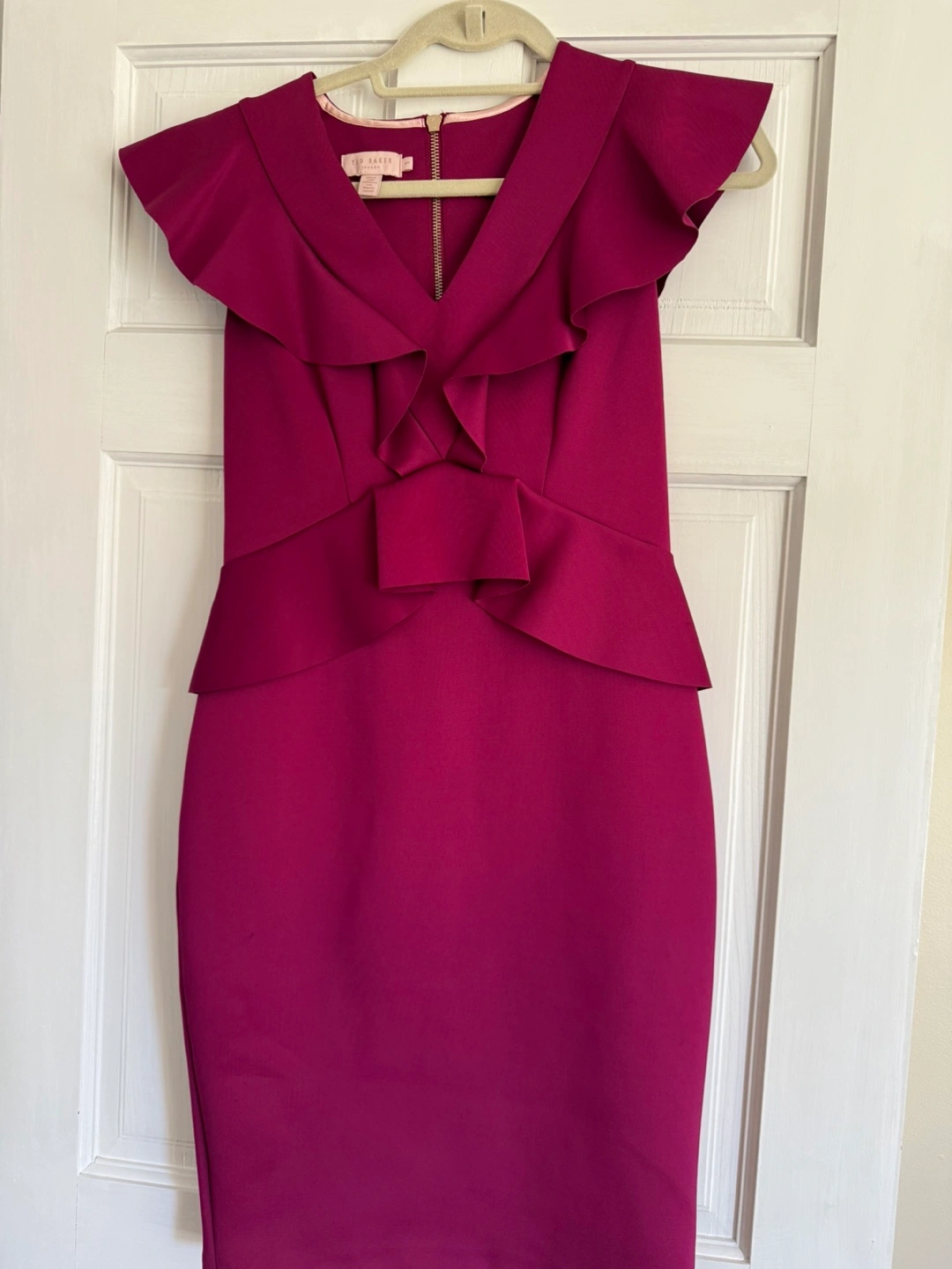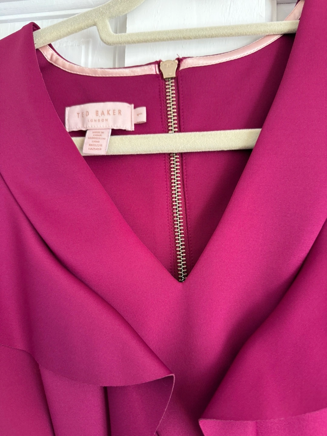 Selling a Ted Baker London dress in size 1. It's a beautiful magenta color with a unique ruffled design. Perfect for a special occasion or a night out! NWOT