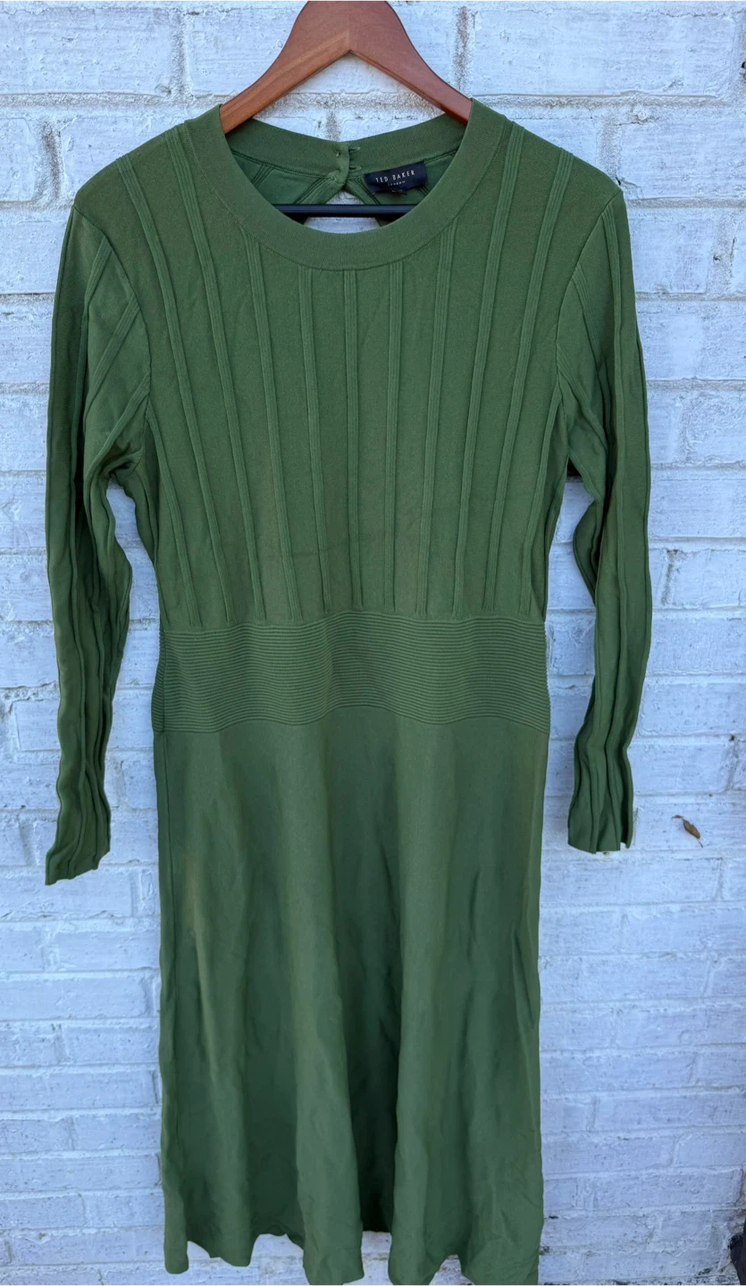 Selling a Ted Baker olive green knit dress! It's in great condition and ready for a new home. The dress features a ribbed design on the upper portion and long sleeves. Perfect for transitioning between seasons! This is a Ted Baker Sayrah midi knit dress in dark green or a similar style
