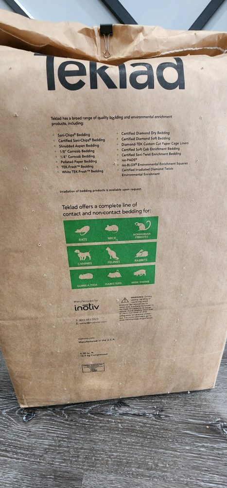 60Selling a bag of Teklad Laboratory Grade Aspen Bedding, model 7093. This bedding is suitable for rats, mice, hamsters, guinea pigs, rabbits, and mini swine. It comes in a compressed size of 4.38 cu ft or 15.9 kg.