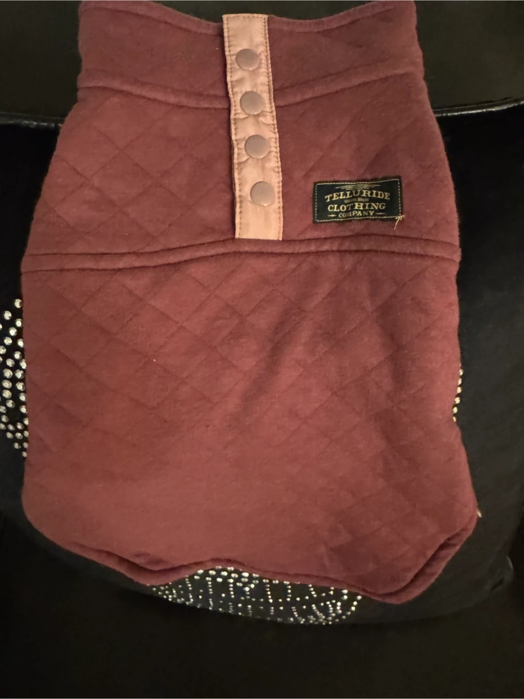 Here's a quilted dog coat from Telluride Clothing Company! It has a stylish design with a button-up front. Perfect for keeping your furry friend warm and cozy.