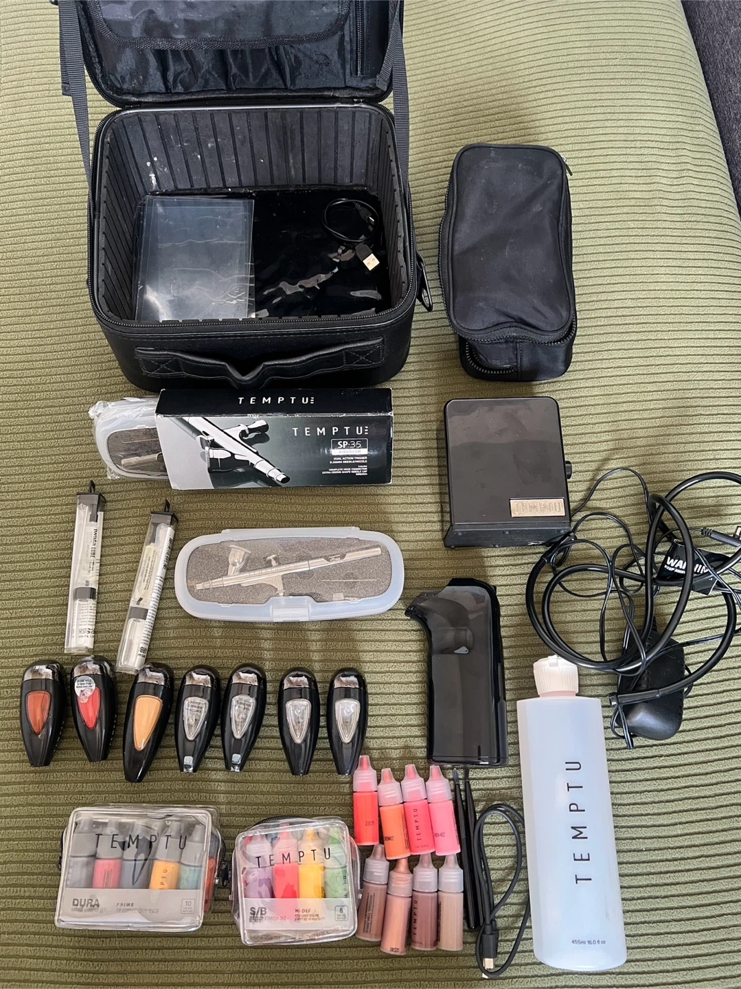 Selling a TEMPTU airbrush makeup system. 2 compressors, 2 TEMPTU SP-35 airbrushes. Also included is a carrying case. Great for creating flawless long lasting makeup looks. The bottle of cleaning solution is 3/4 full