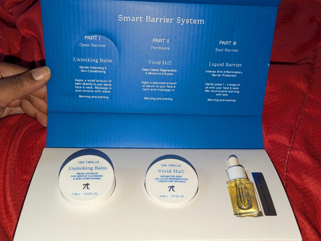 Skincare set includes Unlocking Balm, Vivid H2O, and Liquid Barrier. Retail Value: $58 The SMART BARRIER SYSTEM, inspired by cell biology, works in three precise steps. First, the skin barrier is gently opened in PART I with the cleansing balm to ensure optimal absorption of the active ingredients. After the active ingredients have been introduced in PART II, the skin barrier is carefully sealed again in PART III to effectively lock in the active ingredients and provide long-term protection for the skin.