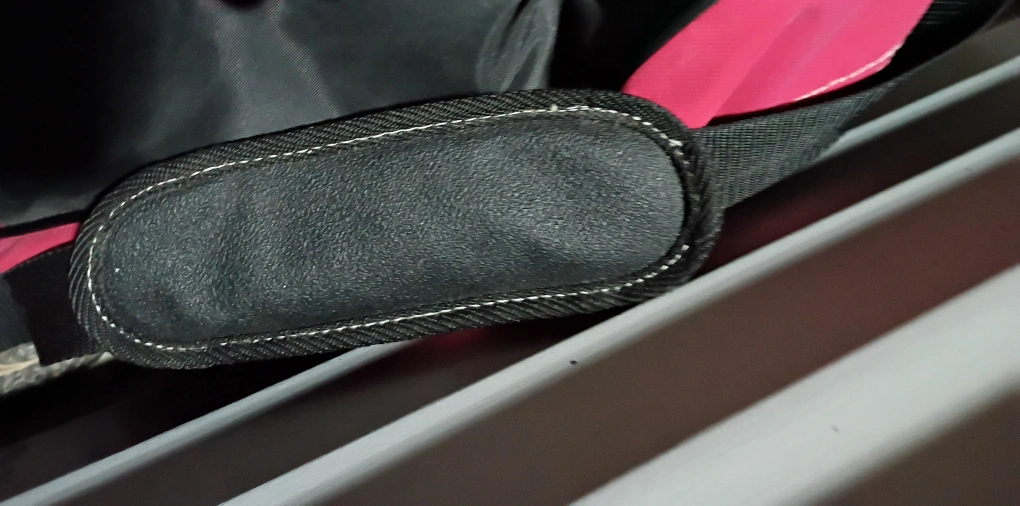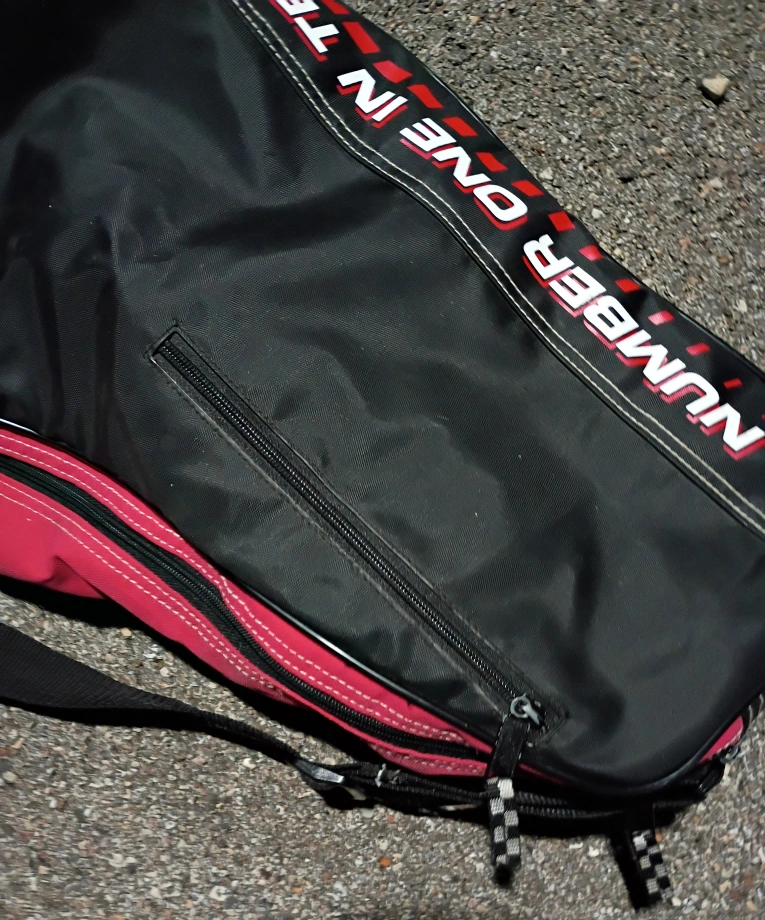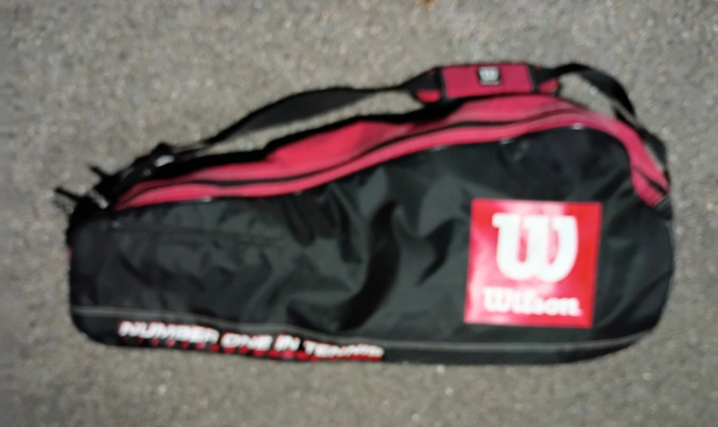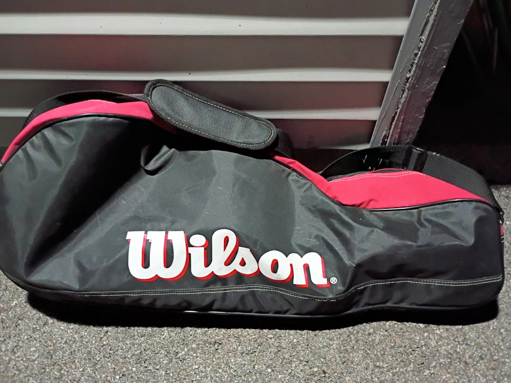 Black, red, and white tennis racket bag with extra room for balls and clothes, zip top, padded shoulder strap, excellent condition