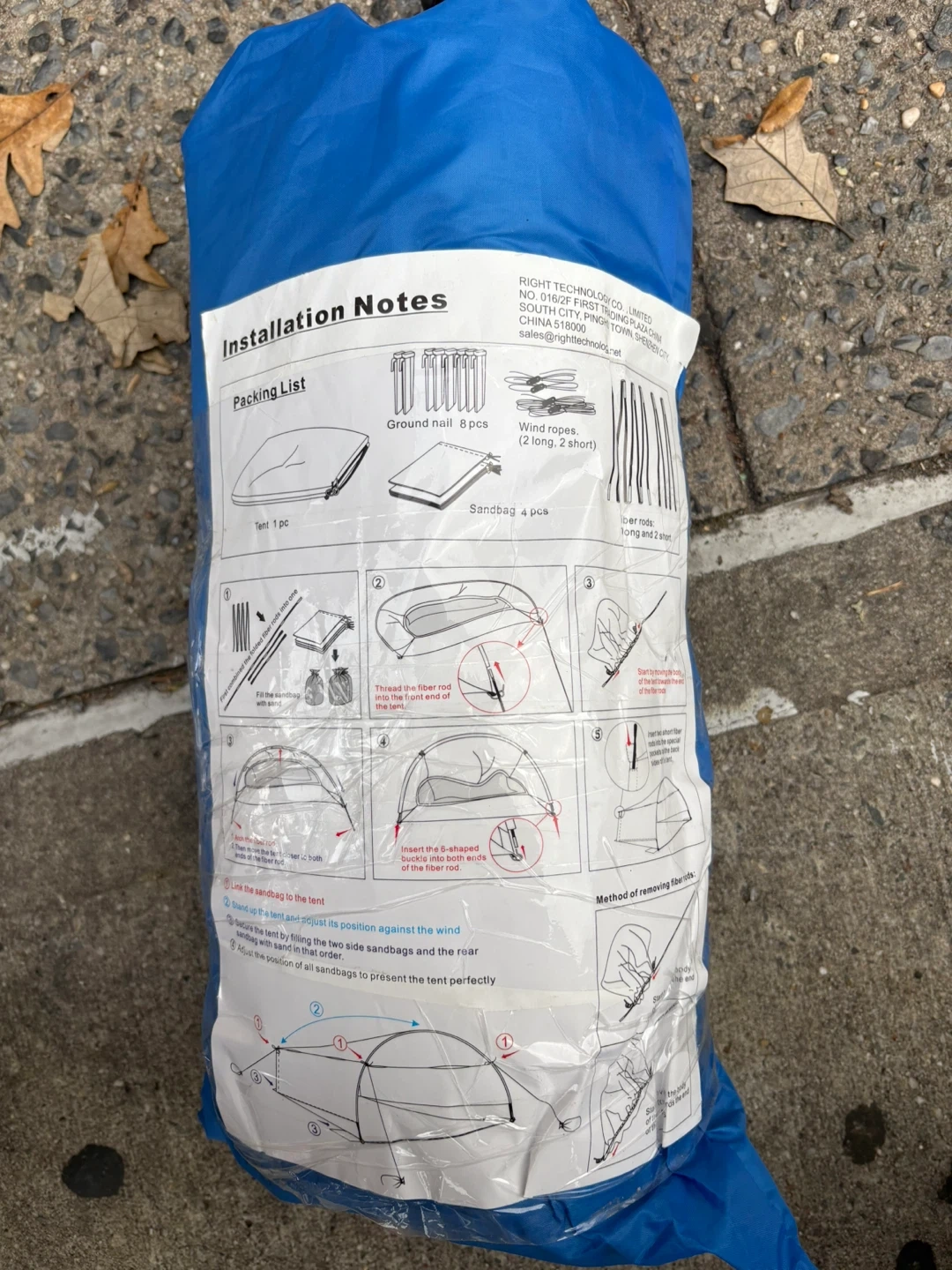 Selling a tent that comes with installation notes. Packing list includes: - Tent (1 pc) - Ground nails (8 pcs) - Wind ropes (2 long, 2 short) - Sandbags (4 pcs)