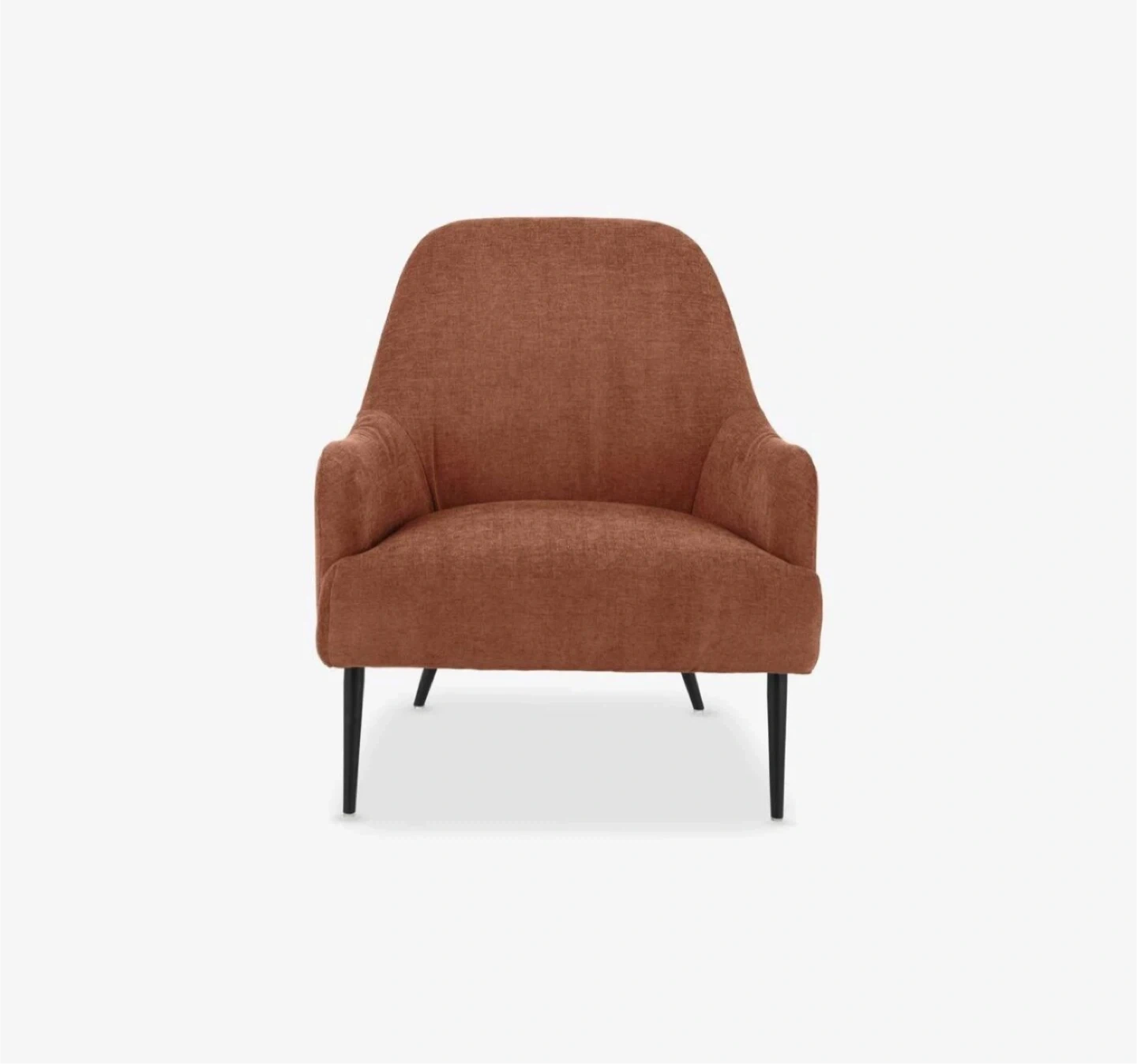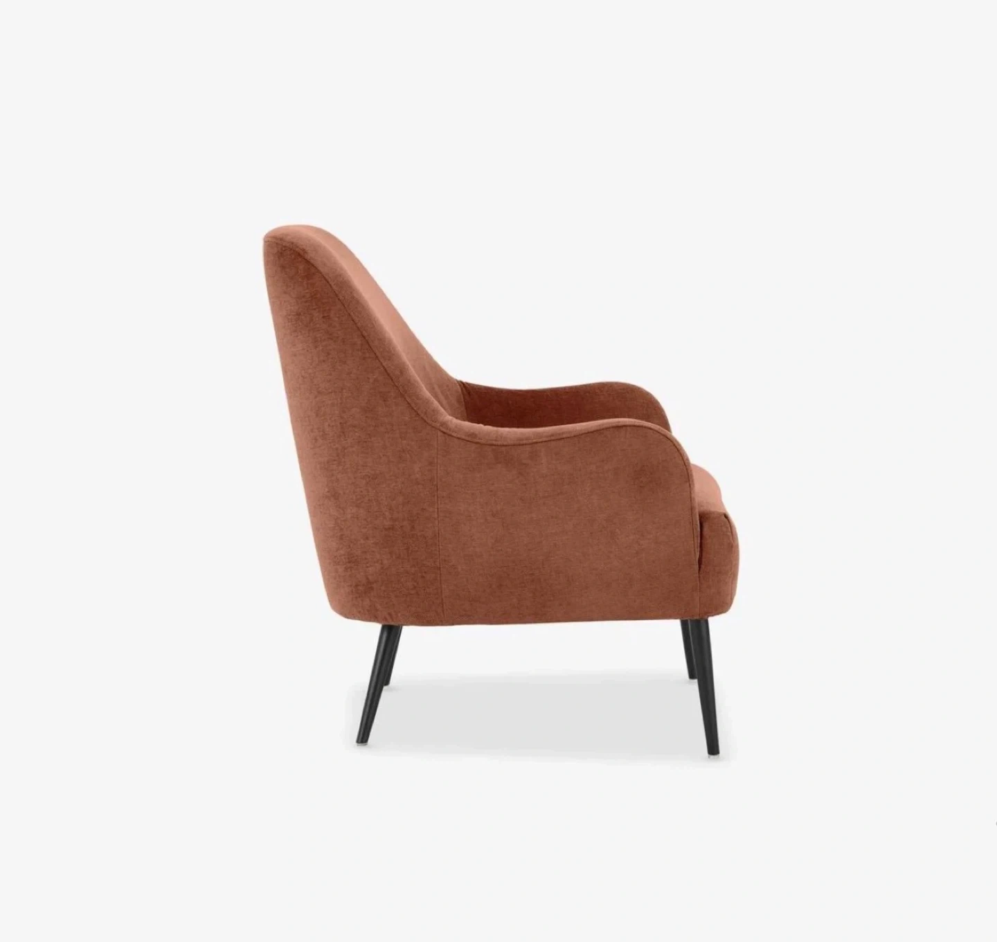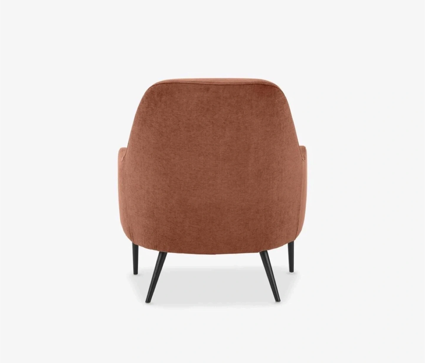 A low profile chair with plenty of groovy curves. The deep seat and plush outline practically beg you to flop right down at the end of a long day. Chenille upholstery in a perfectly balanced shade of terra cotta. Perfectly maintained and in great condition!