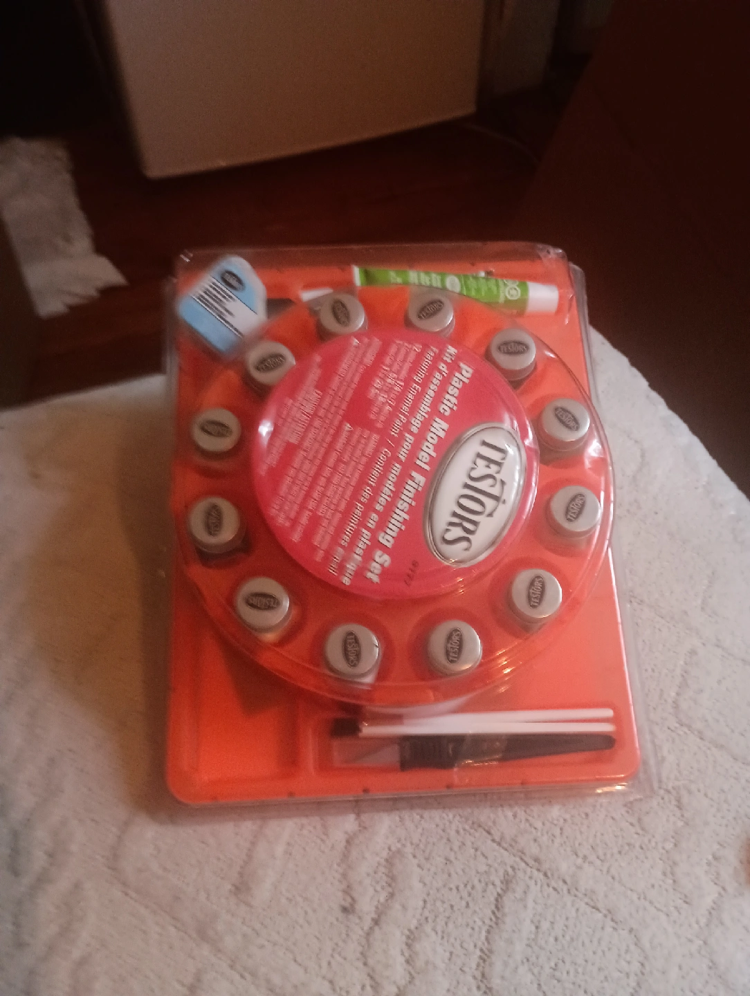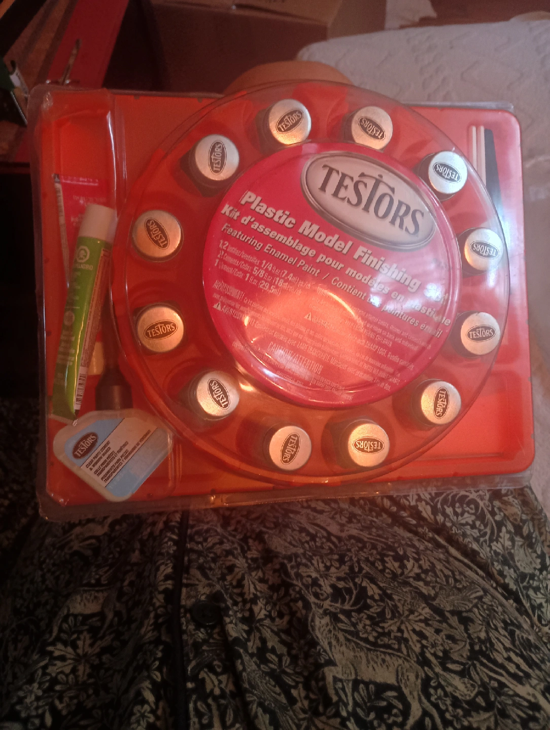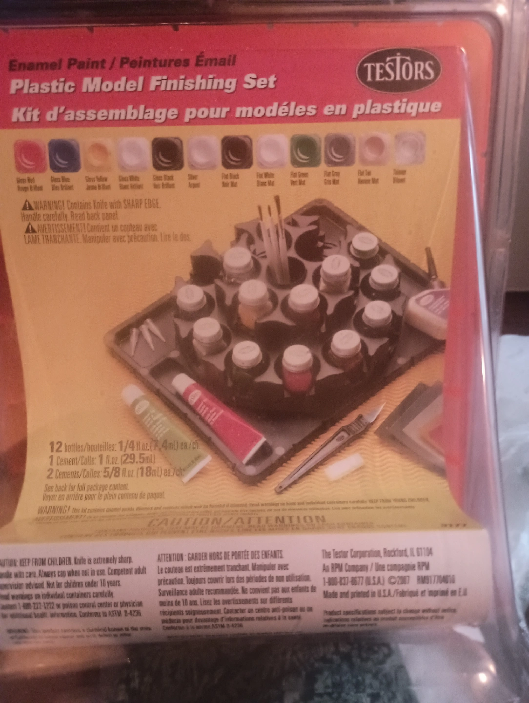 Selling a Testors Enamel Paint Plastic Model Finishing Set. It includes 12 bottles of enamel paint, 1 cement/colle, and 2 cements/colles. Perfect for plastic model finishing!