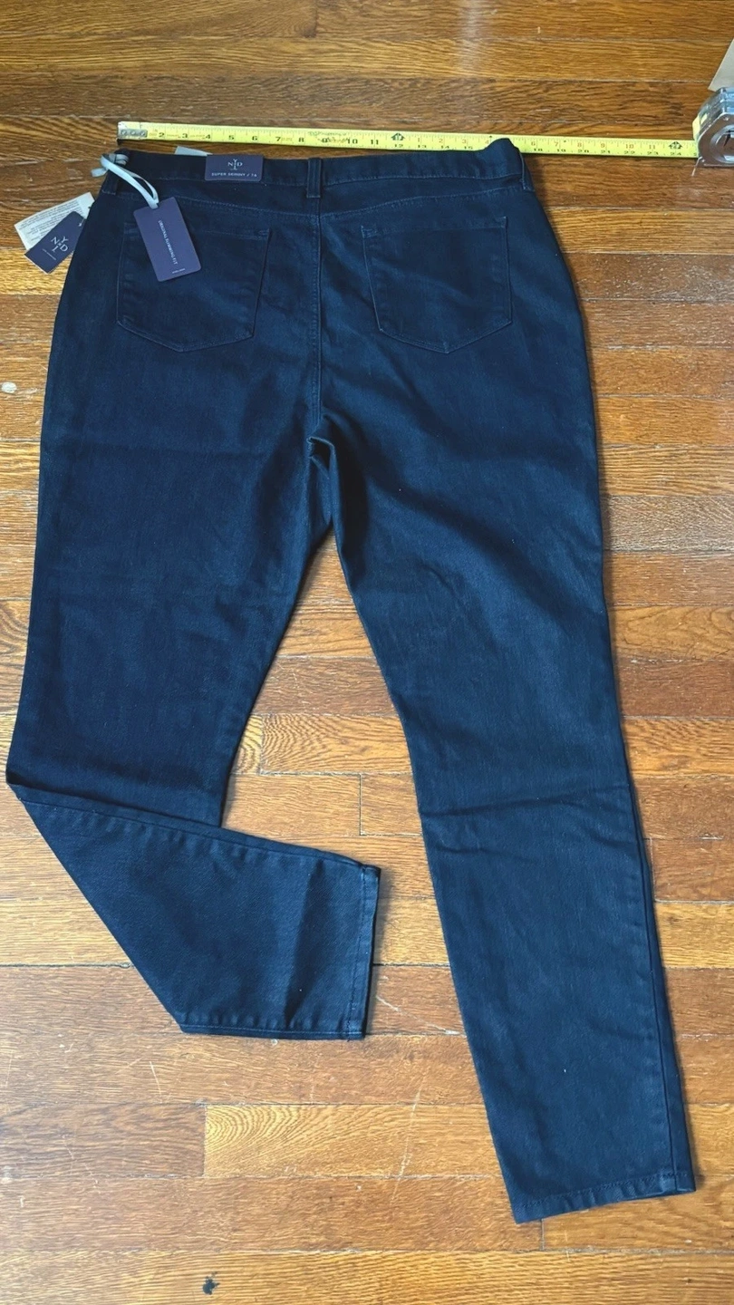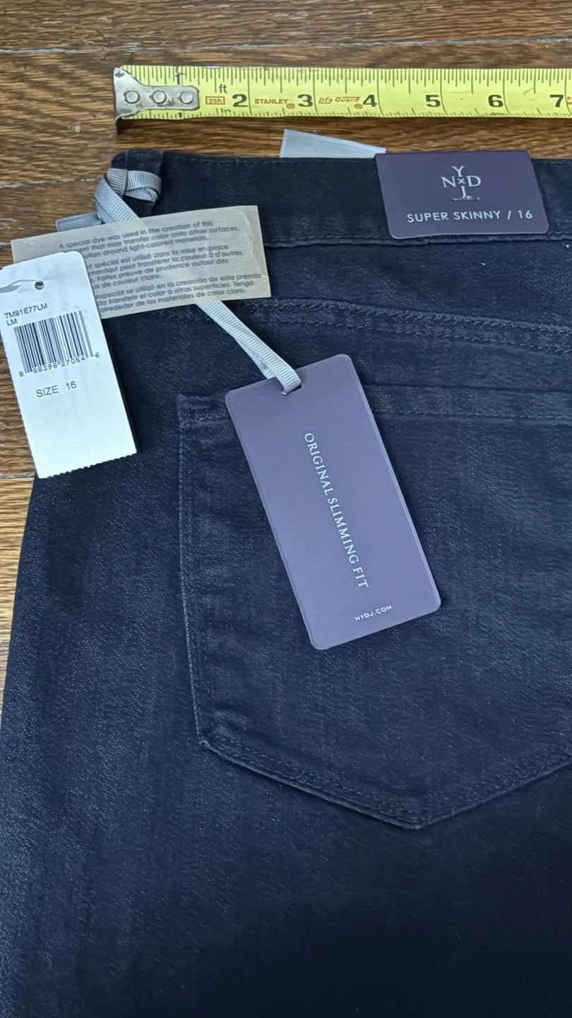 New with tags. Women's size 16 skinny jeans in dark blue denim. Features a 12" rise, 27" inseam, and a comfortable polyester blend fabric with stretch. Classic 5-pocket design with button and zip closure. Machine washable.