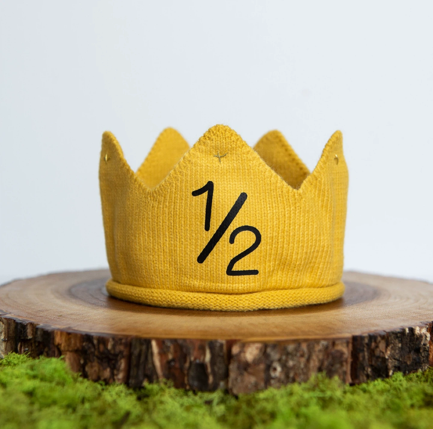 This yellow knit crown hat features a "1/2" graphic. It's perfect for celebrating a baby's half birthday! Soft knit material.