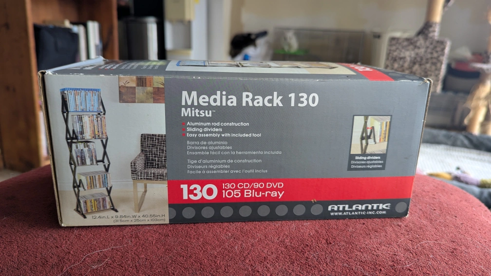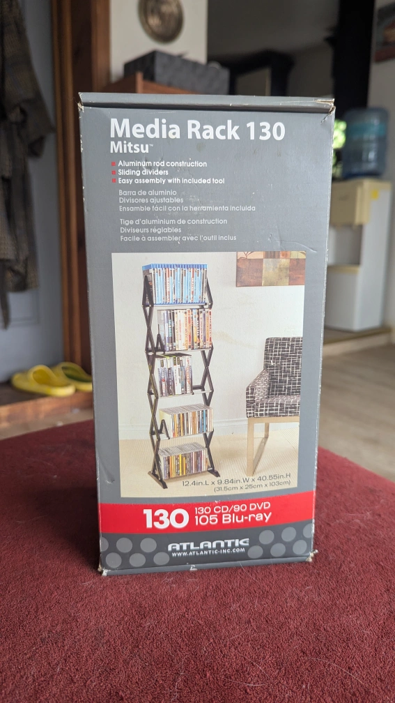 Never taken out of the box. Selling an Atlantic Mitsu Media Rack 130! It can hold 130 CDs, 90 DVDs, or 105 Blu-rays. It features aluminum rod construction and sliding dividers. Easy assembly with included tool. Dimensions are 12.4in L x 9.84in W x 40.55in H