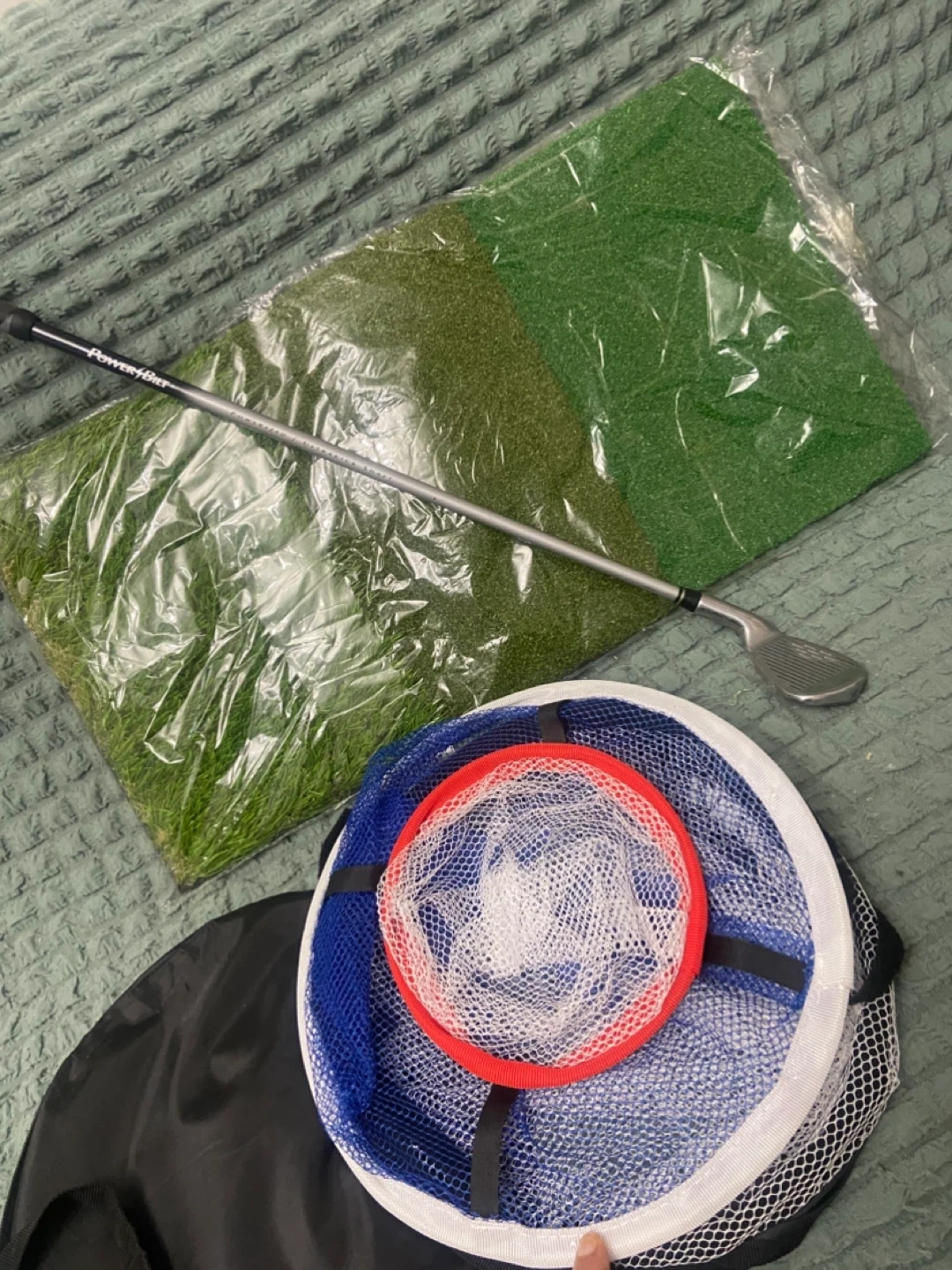 This set includes a PowerBilt TPS 6.0 Oversize 9 Iron golf club. Also comes with two golf hitting mats, a portable golf net, and a black storage bag. Great for practicing your swing indoors or outdoors!
