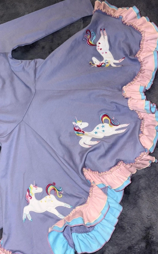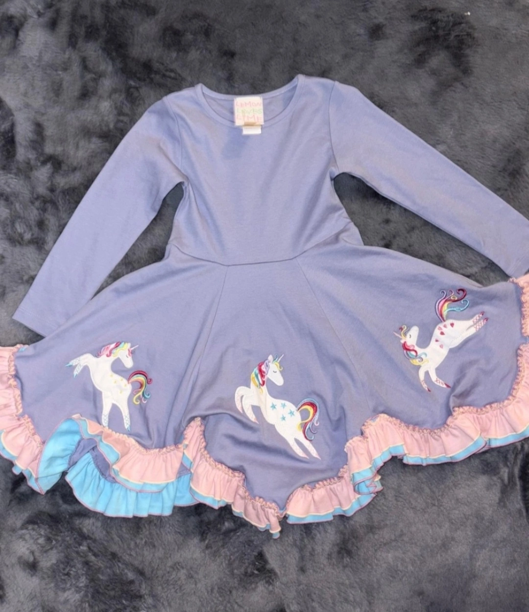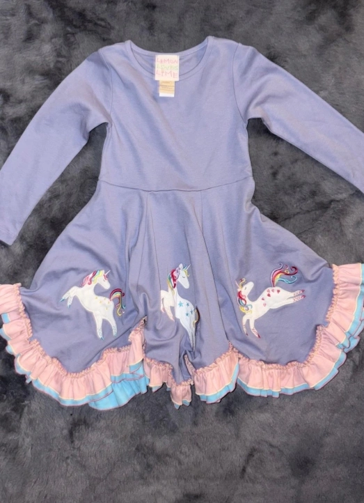 This adorable long-sleeve dress features a pale lavender base with playful unicorn appliques across the skirt. It's adorned with tiered ruffle trim in pink and blue. Size is 4 years.