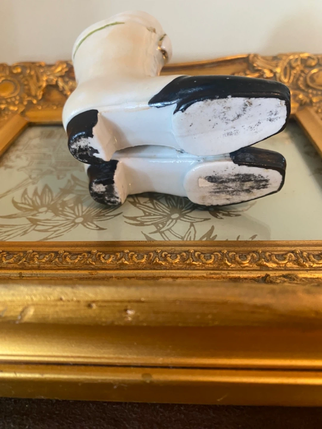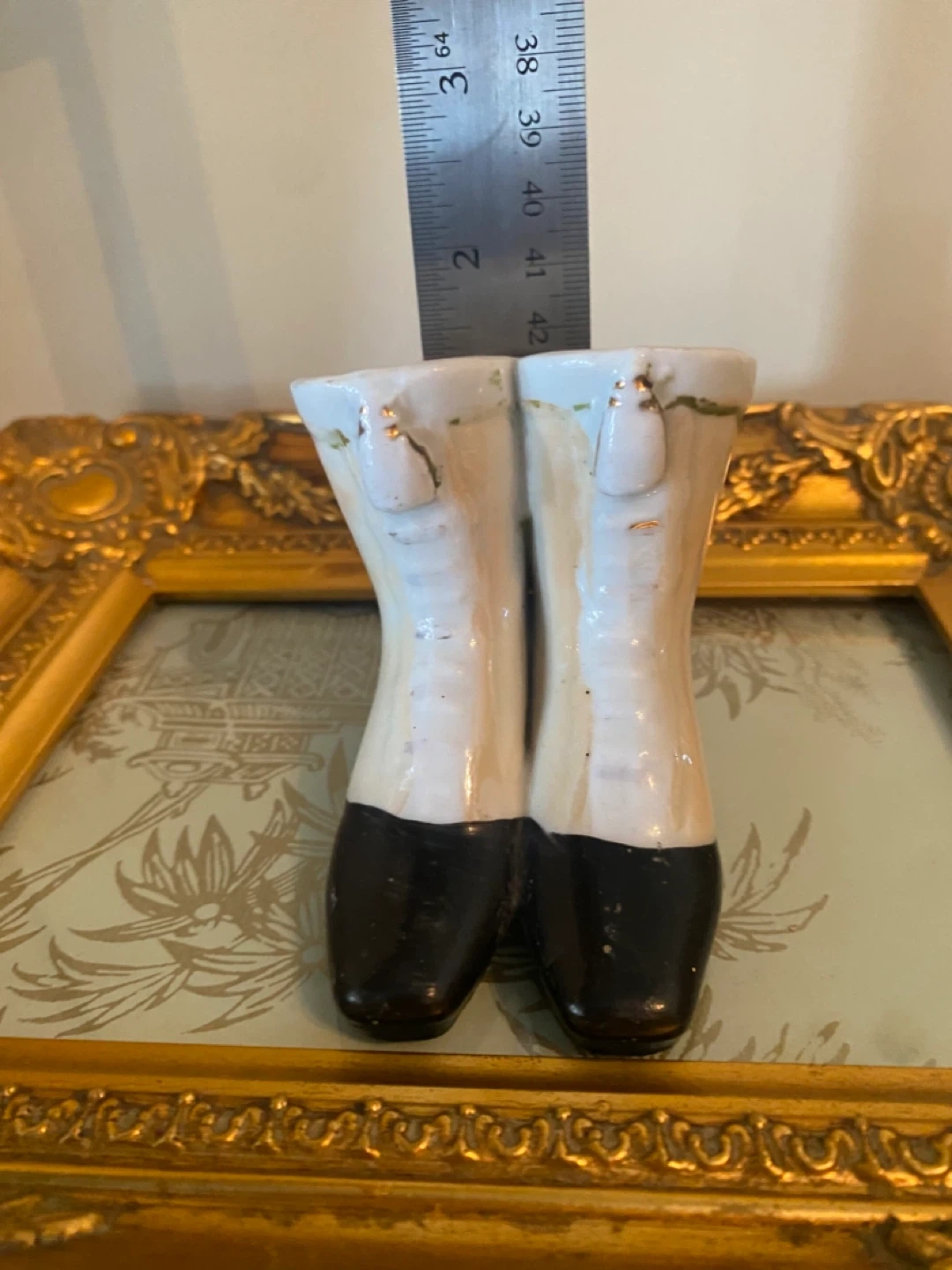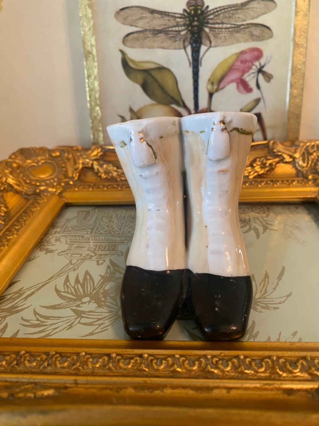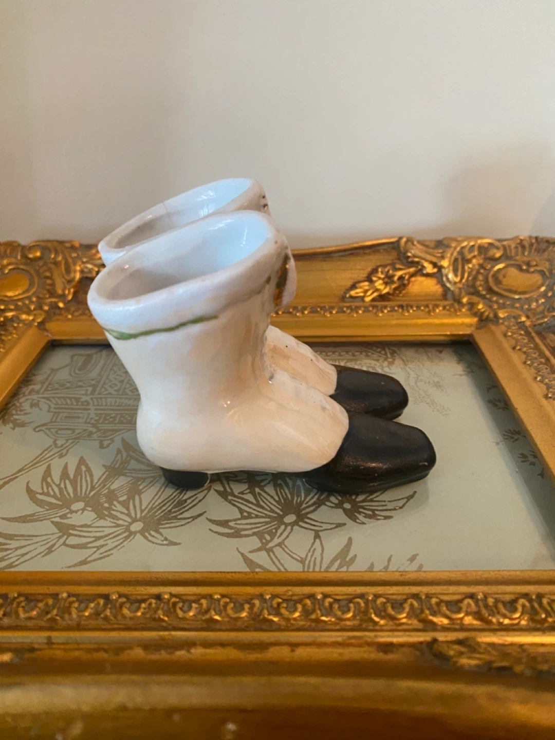 This is a vintage ceramic vase shaped like a pair of boots. It has a white and beige top with black bottoms. It's a unique piece that'll add charm to any room! please follow me @casa_s_decor
